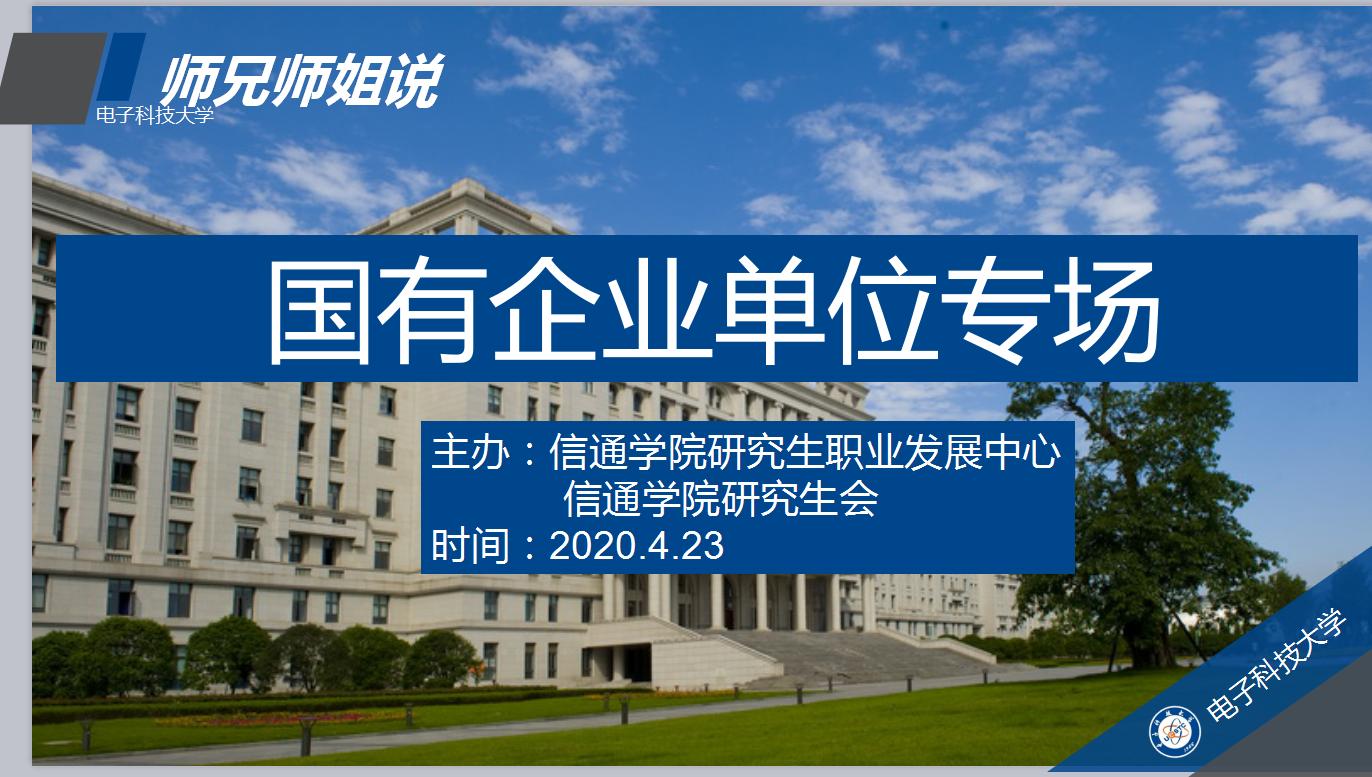 2020年4月23日晚7点,公司研究生职业发展中心和研究生会联合举办第三届“师兄师姐说”之国有企业和选调生专场。由于疫情原因,第三届“师兄师姐说”系列活动全部采用线上会议的方式进行。本场分享会邀请到6位优秀的师兄师姐,他们分别是签约国网福建省电力有限公司的陈秋敏,许继集团有限公司的鲍俊玲,东方红卫星移动通信有限公司的舒培,广州海格通信集团有限公司何旬,中兴通讯股份有限公司蓝剑计划的王林翰以及黑龙江省委组...