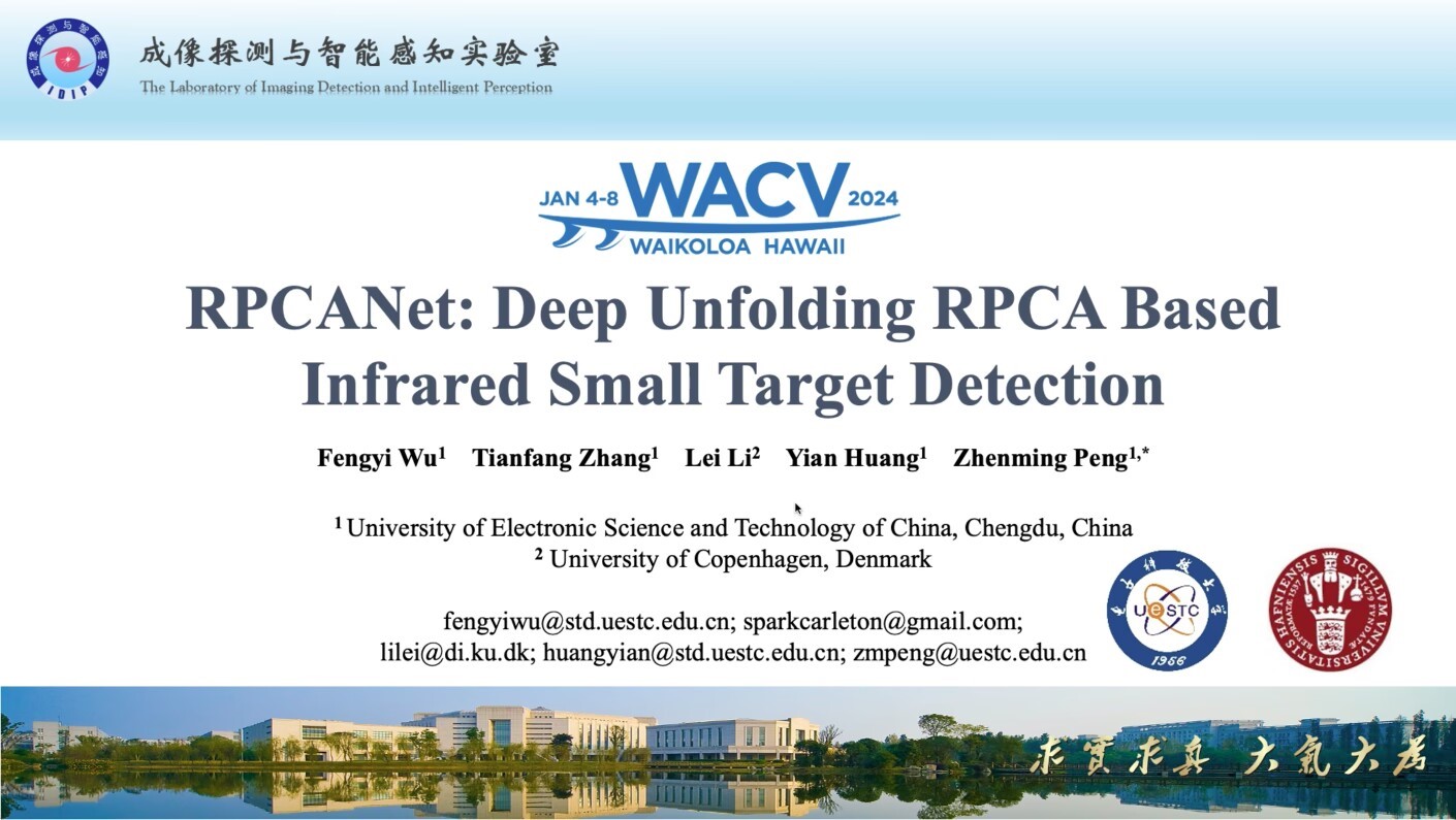 近日,伟德国际victor1946成像探测与智能感知(IDIP)实验室在红外小目标检测领域再次取得重要研究进展,在2024年WACV国际会议发表了题为“RPCANet: Deep Unfolding RPCA Based Infrared Small Target Detection”的学术论文。2023级博士生伍风翼与商汤科技张天放博士为该论文共同第一作者,彭真明教授为唯一通讯作者,电子科技大学和丹麦University of Copenhagen为共同完成单位。红外探测系统具有更好的抗干扰能力,在地面监视、空间探...