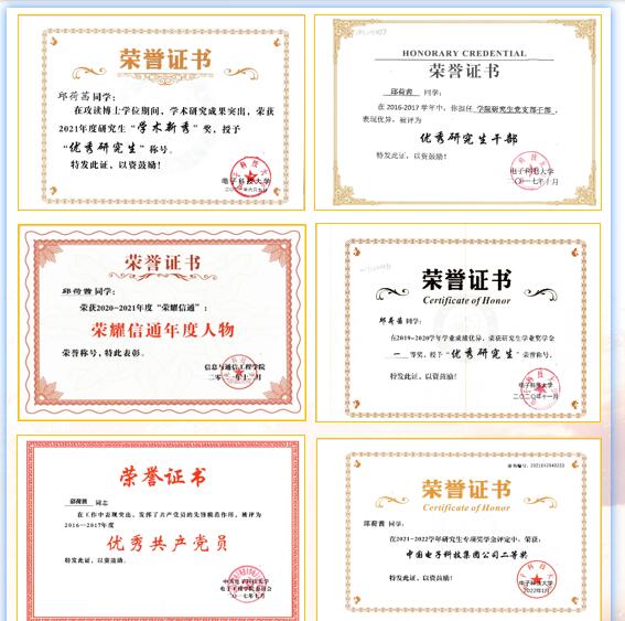 功夫不负有心人,在攻读博士学位期间,邱荷茜厚积薄发,在科研实践中摘取众多优异成果,入选首批四川省博新计划、2022年度成电杰出员工、荣耀信通年度人物、电子科技大学“学术新秀”,并荣获川渝博士后学术成果展示一等奖、学业一等奖学金、深圳证券交易所奖学金、中电集团专项奖学金等诸多荣誉。
