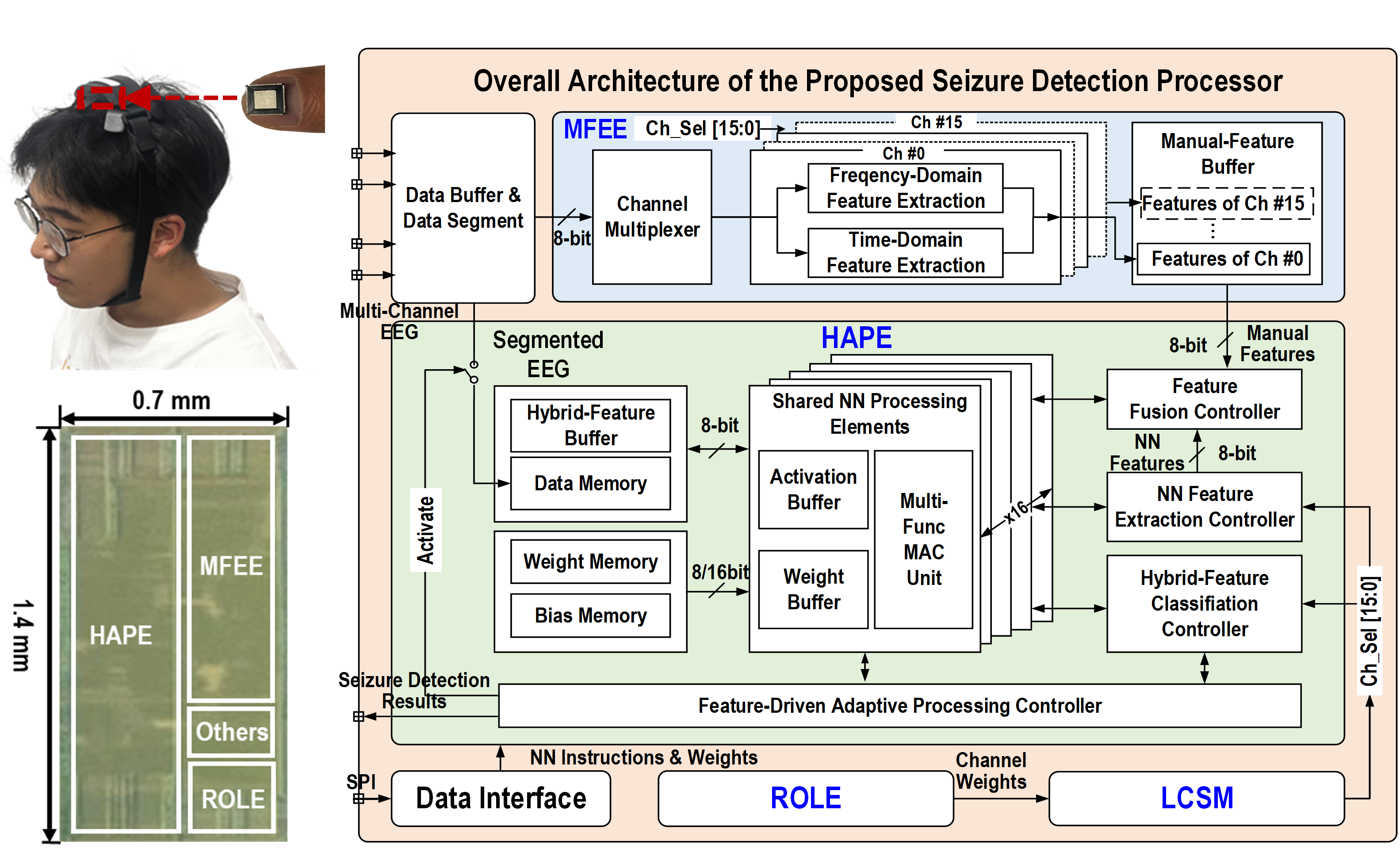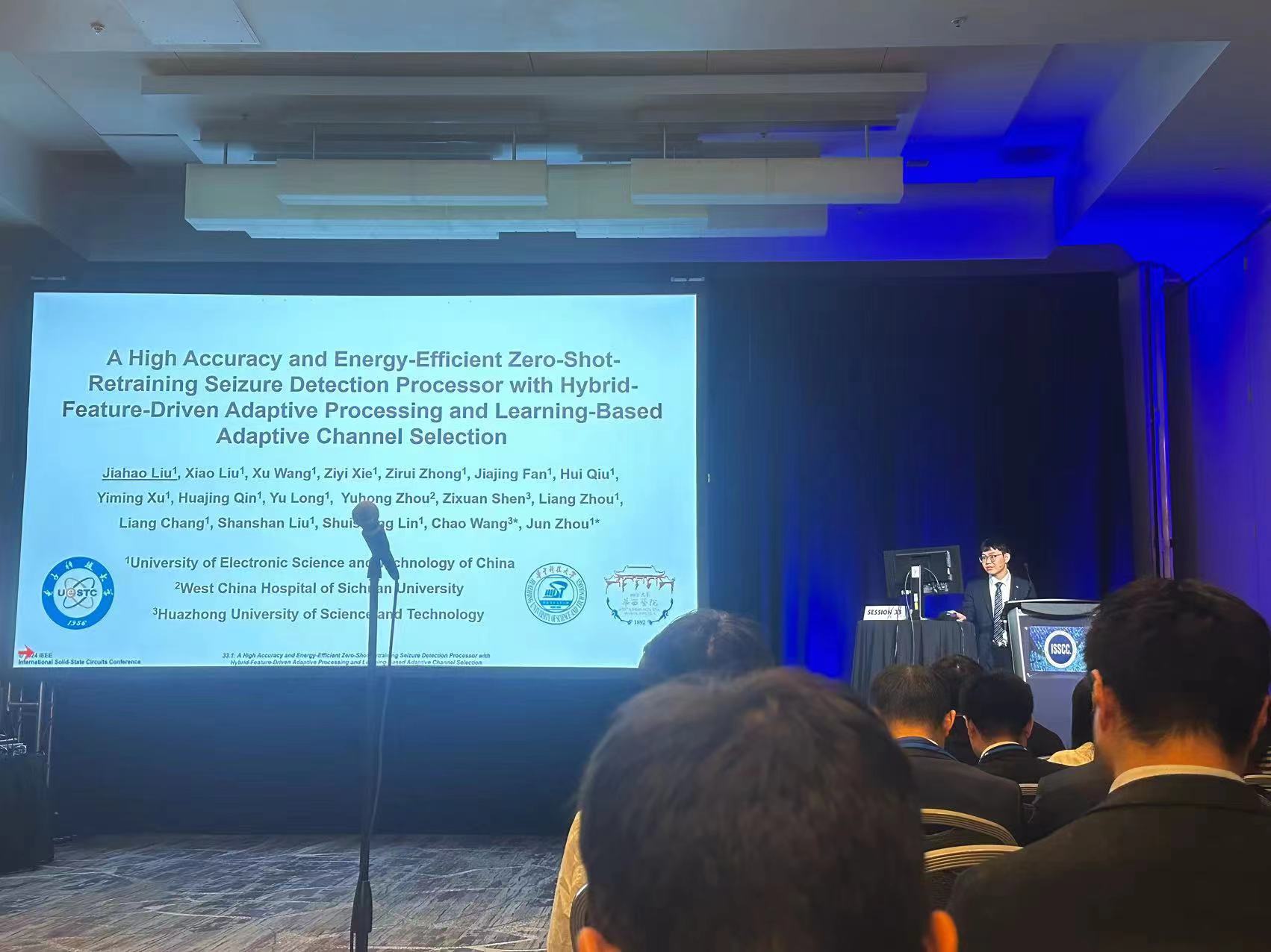 另一款芯片是超低功耗脑电识别AI芯片。近年来,随着脑机接口、脑电监测等应用兴起,基于深度学习的智能脑电识别设备可以实现诸如癫痫检测、意念控制、情绪感知、睡眠监测等功能。然而,现有设计面临两个问题:1. 为解决用户差异性带来的准确率问题,需要采集用户的脑电数据用于增量训练,如癫痫检测任务需要采集用户的癫痫数据,由于该类数据出现频率低,需要数周甚至数月入院监测,实用性较差。2. 深度学习技术的引入导致功耗上升,不适合穿戴式脑电设备。针对以上挑战,周军教授带领员工设计并实现了一款超低功耗脑电识别AI芯片,提出了融合机器学习和深度学习的自适应AI处理架构、小样本片上在线学习电路和基于在线学习的自适应脑电通道筛选电路等多项技术,降低了对用户样本的需求,同时实现了极低处理能耗。在癫痫检测任务中,该芯片在不需要采集病人癫痫信号的前提下,准确率达到98%以上,同时平均每次识别能耗仅为约0.07微焦,达到了国际同类设计最低能耗,相比发表在ISSCC 2023的最新工作,准确率提升了近10%,能耗降低了90%以上。该芯片支持神经网络编程和多通道脑电处理,还可用于脑机接口、睡眠监测等应用。该论文被ISSCC TPC委员会评为ISSCC 2024亮点论文,电子科技大学为第一单位,四川大学华西医公司和华中科技大学为联合单位。第一作者为周军教授的博士生刘嘉豪,周军教授和华中科技大学王超教授为共同通信作者。