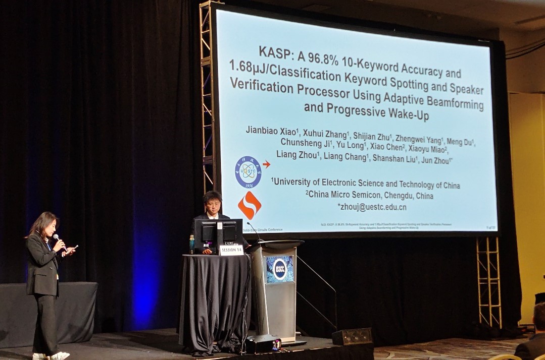 其中一款芯片是超低功耗离线语音控制AI芯片。近年来,智能家居、智能座舱、智能玩具等语音控制应用逐渐兴起,通过在智能终端嵌入离线语音控制AI芯片,可以通过语音来控制设备的多种功能。相比在线语音控制,离线语音控制具有保护隐私、响应及时等优点。然而,现有设计面临两个问题:1. 深度学习的引入提升了识别准确率,但导致计算功耗大幅上升,不适合功耗受限的端侧设备。2. 识别准确率容易受到环境噪声,尤其是其他人声的干扰(如电视、电话等人声)。针对以上挑战,周军教授带领员工设计并实现了一款超低功耗自适应抑噪离线语音控制AI芯片,结合模型、架构和电路协同优化,提出了多任务动态重构AI处理架构、多阶段自适应事件驱动处理电路、基于波束成形的自适应噪声抑制电路、关键词/声纹识别融合电路等多项技术,实现了微瓦级高准确率离线语音控制,平均每次识别能耗仅为约2微焦,安静场景识别准确率在95%以上,人声干扰下也可达90%以上,达到了国际同类设计最低能耗和最高准确率,并可同时支持关键词和声纹识别。该芯片适用于智能家居、智能座舱、智能玩具等低功耗离线语音控制应用。该论文第一单位为电子科技大学,中微半导体(深圳)为联合单位。第一作者为周军教授的博士生肖剑彪,周军教授为通信作者。
