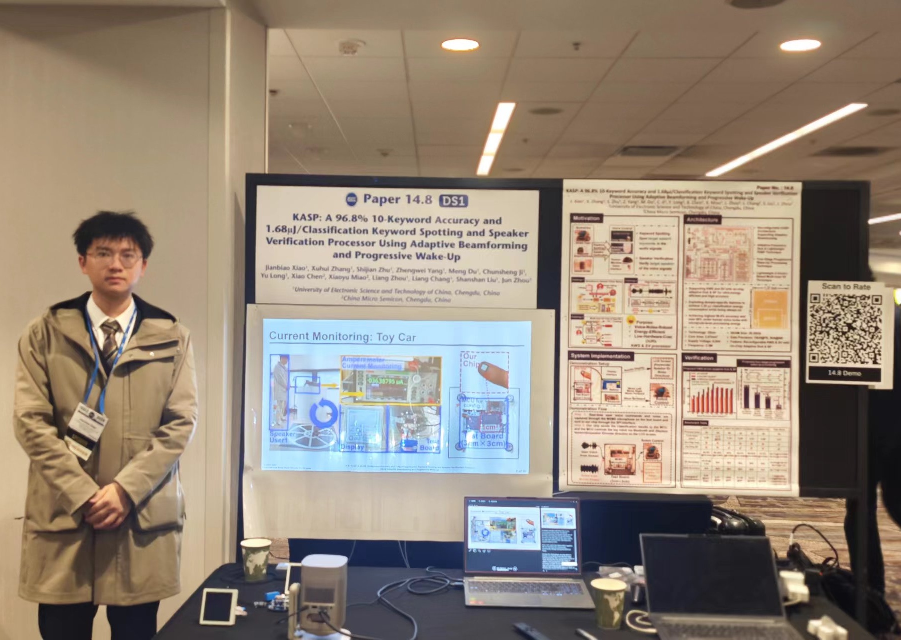近日,伟德国际victor1946周军教授团队在芯片设计奥林匹克会议International Solid-State Circuits Conference(ISSCC) 2024发表了两项超低功耗端侧AI芯片的工作。ISSCC是世界学术界和企业界公认的芯片设计领域最高级别会议,众多芯片历史上里程碑式的发明都是在该会议上首次披露,入选ISSCC的工作代表着当前国际顶尖水平。该会议于2024年2月18日至22日在美国旧金山举行,周军教授的博/硕士研究生刘嘉豪、肖剑彪、刘骁、张旭辉参加了会议,并作了口头报告和现场演示。