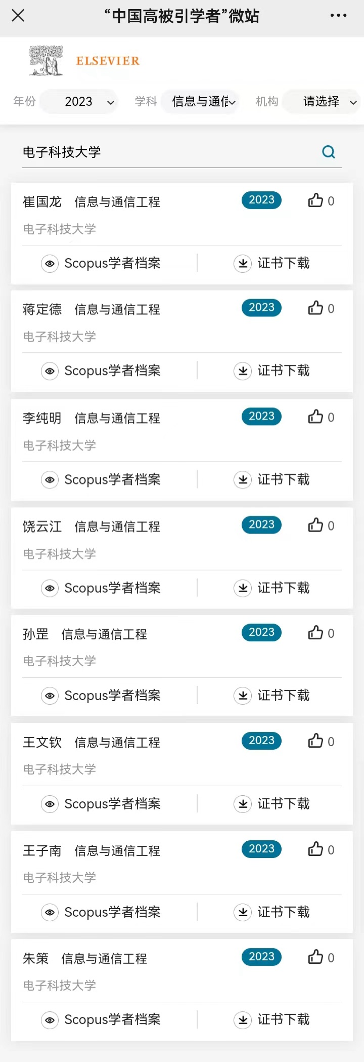 3月27日,爱思唯尔 (Elsevier) 重磅发布2023“中国高被引学者” (Highly Cited Chinese Researchers) 榜单。电子科技大学入选2023中国高被引学者共66位,其中伟德国际victor1946共8名学者入选,入选者分别是崔国龙、蒋定德、李纯明、饶云江、孙罡、王文钦、王子南、朱策(按姓氏首字母排序)。