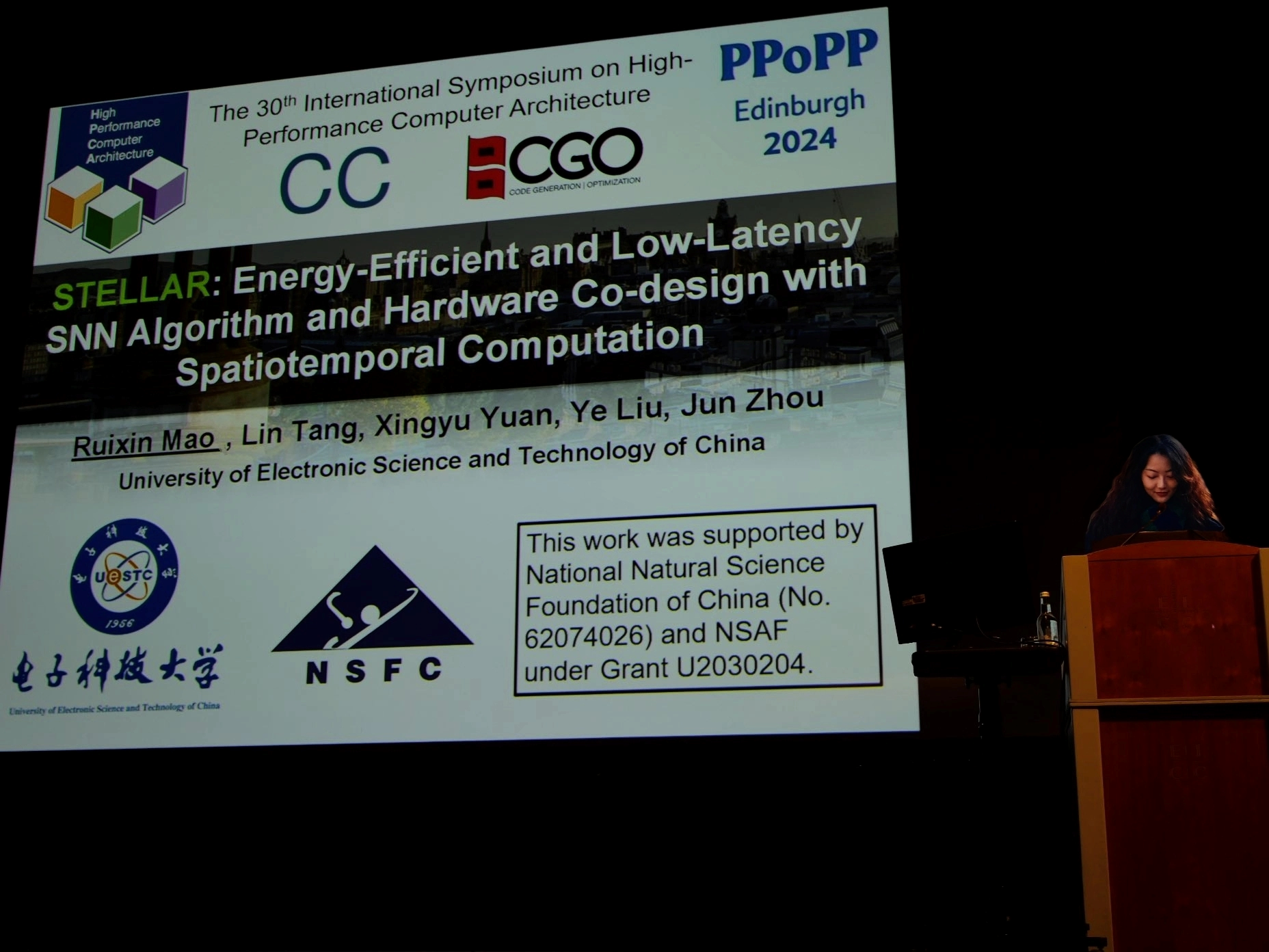 近日,伟德国际victor1946周军教授团队在计算机体系结构领域顶级会议International Symposium on High-Performance Computer Architecture (HPCA) 2024上宣读了团队在类脑计算芯片方向的研究工作“STELLAR: Energy-Efficient and Low-Latency SNN Algorithm and Hardware Co-design with Spatiotemporal Computation”。HPCA是由IEEE举办的计算机体系结构领域的顶级会议,涵盖处理器架构、并行计算、存储系统等主题,也被视作计算机体系结构研究的风向标,中国大陆作为第一作者单位的论文平均每年的接受数量小于10篇。该论文是电子科技大学首次在HPCA上发表论文,标志着电子科技大学在类脑计算芯片领域取得重要进展。今年HPCA共收到410篇投稿,最终接受75篇,录用率为18.3%。该论文的通讯作者为周军教授,第一作者为周军教授的博士生毛睿昕,共同作者包括周军教授的研究生唐林(硕),袁兴禹(硕)和刘野(博)。