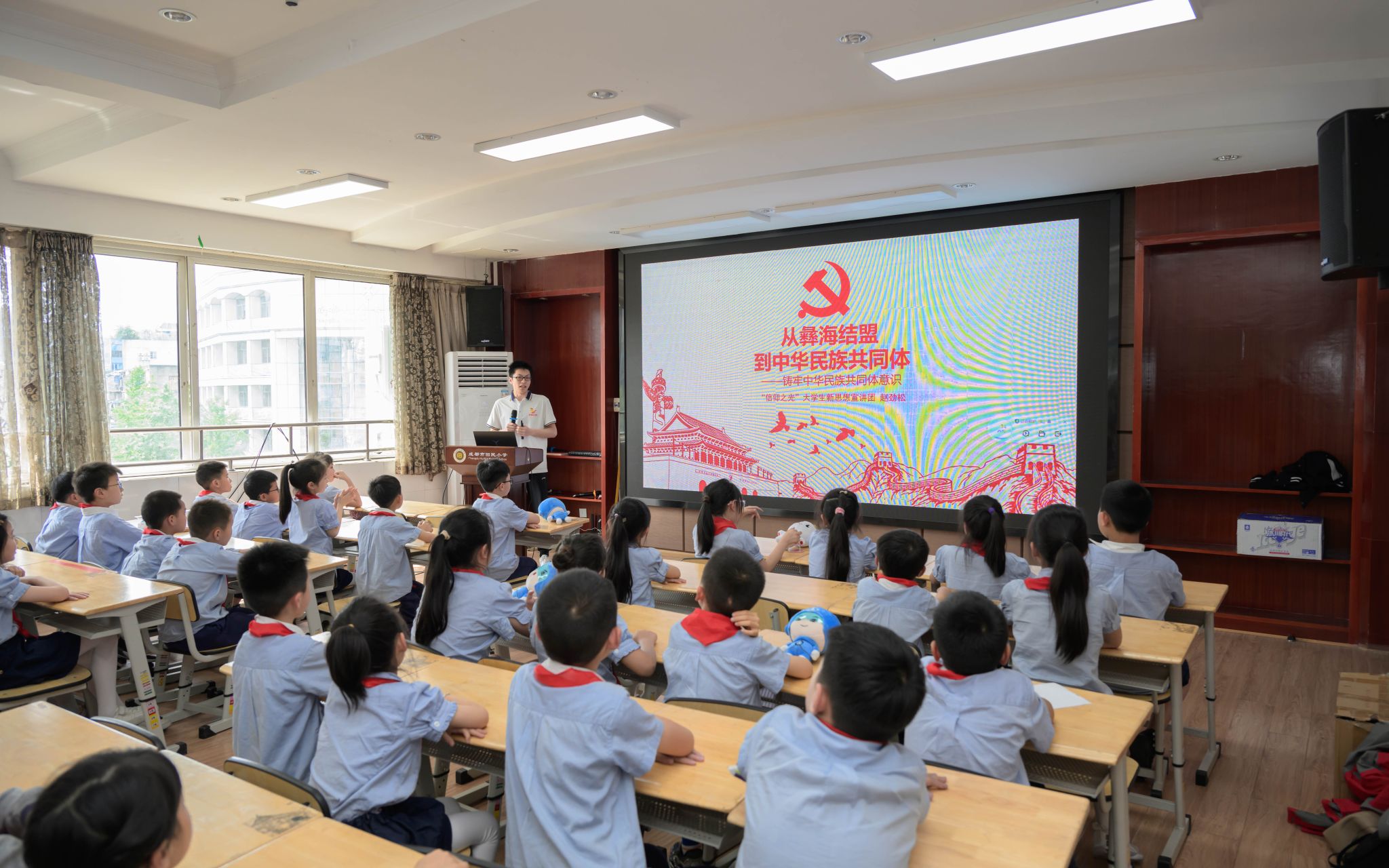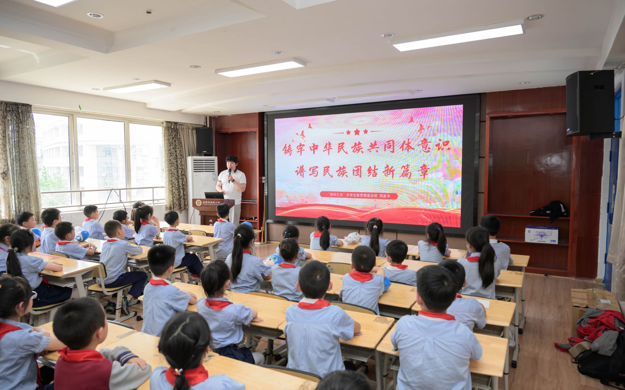本科生第七党支部党员、“信仰之光”宣讲团成员周星宇,“信仰之光”宣讲团成员赵劲松围绕“铸牢中华民族共同体意识”进行主题宣讲,通过讲述彝海结盟的故事,介绍其美多吉、孔繁森等民族团结典范的事迹和各民族传统文化引导在场小员工树立中华民族共同体意识,理解维护民族团结的重大意义。他们在宣讲中提出期望,希望新时代少先队员们能满怀身为中华民族一员的荣誉感和自豪感,以更加饱满的热情和坚定的信念,共同铸牢中华民族共同体意识,为实现中华民族伟大复兴的中国梦贡献力量。