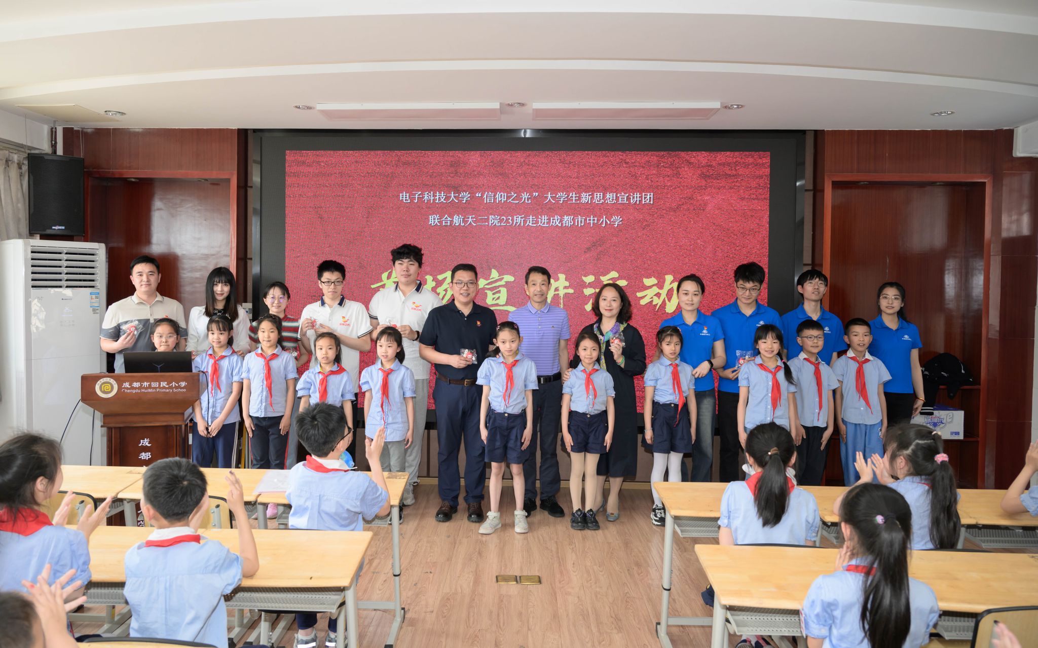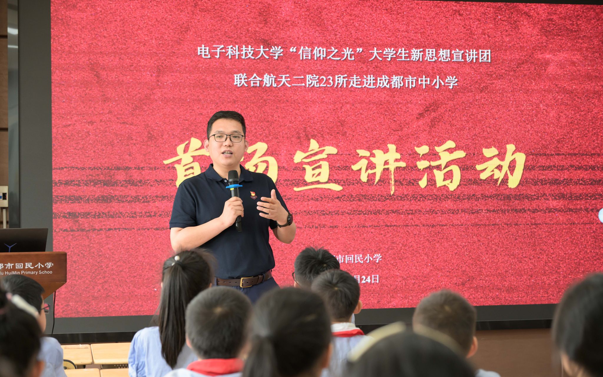 4月24日,在第九个“中国航天日”到来之际,伟德国际victor1946本科生第七党支部联合共建支部中国航天科工二院二十三所成都研发中心,组织公司“信仰之光”老员工新思想宣讲团与中国航天科工二院二十三所航天精神科普宣讲团,前往百年名校成都市回民小学,开启走进成都市中小学的首场理论宣讲活动。成都市回民小学党支部书记、董事长陈绍光,电子科技大学党委员工工作部副部长张琼,信息与通信工程公司党委副书记耿宝莹,中国航天科工二院二十三所成都研发中心党支部组织委员马博士等领导嘉宾出席活动。