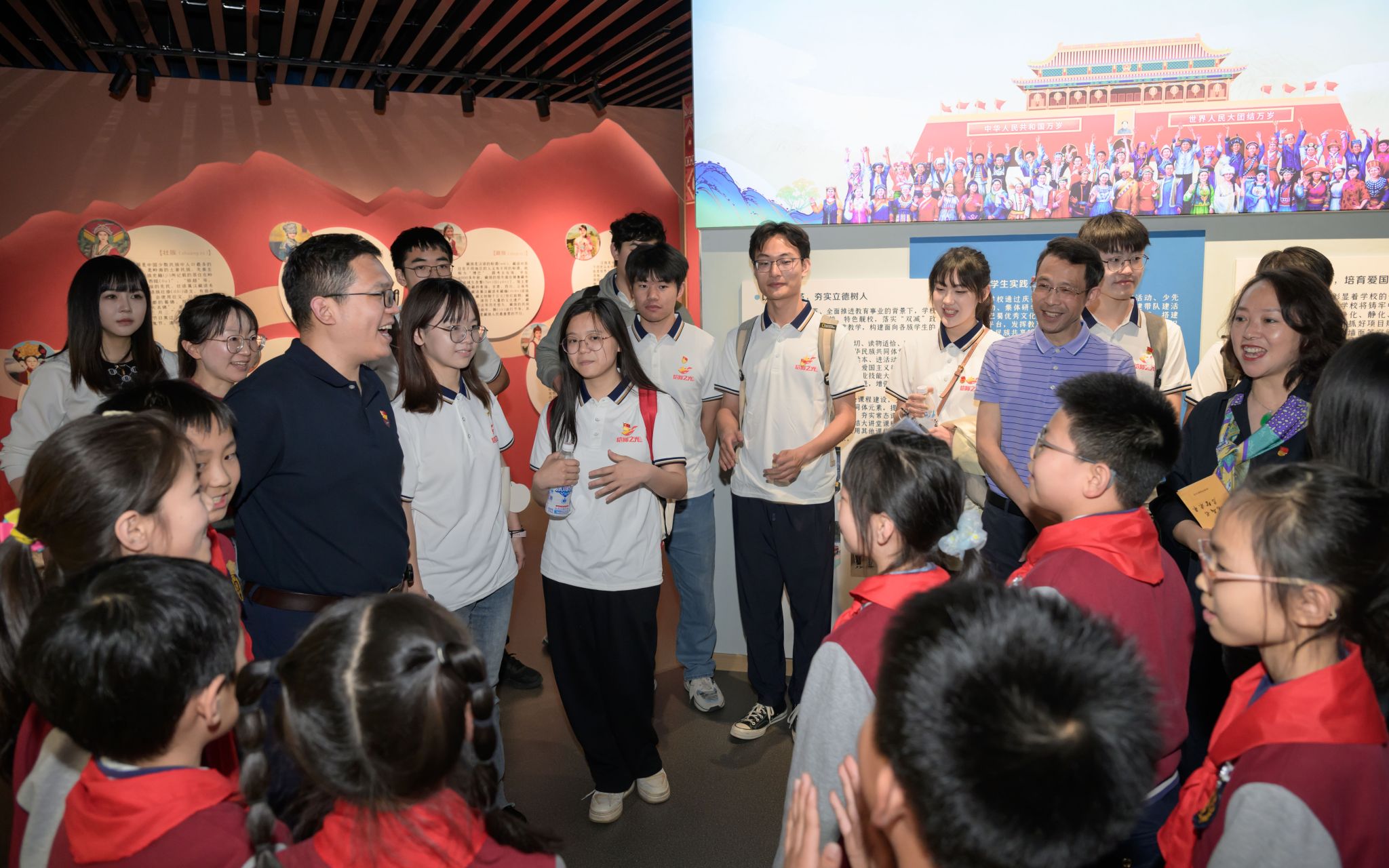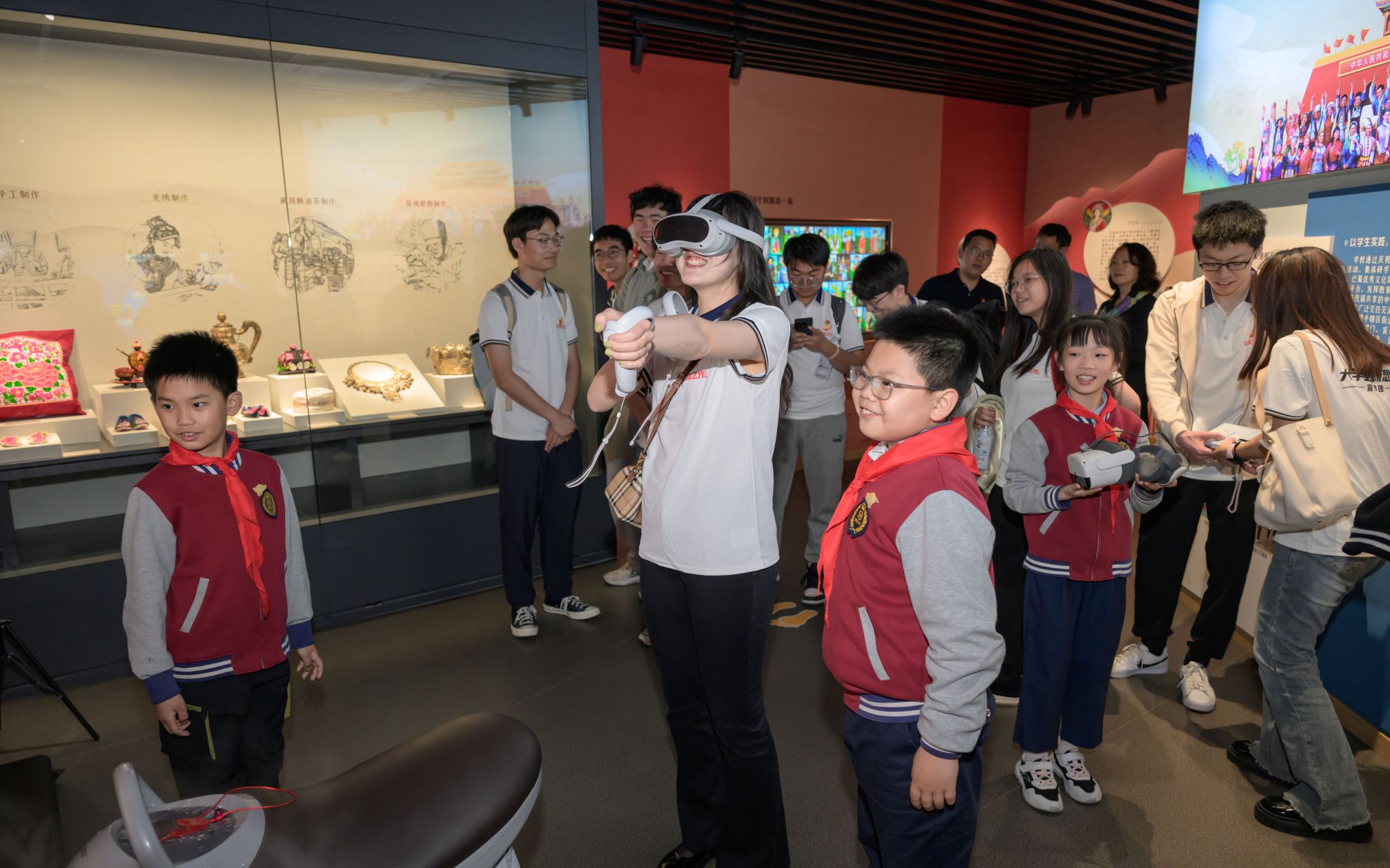 随后,在回小“红领巾”讲解员的带领下,师生们参观回民小学铸牢中华民族共同体意识主题教育基地——“爱我中华”民族魂教育展陈馆。通过亲身体验VR实景漫游、参观各民族精美文物等,感受该校因校制宜,借助信息化手段创新民族团结进步教育的举措。