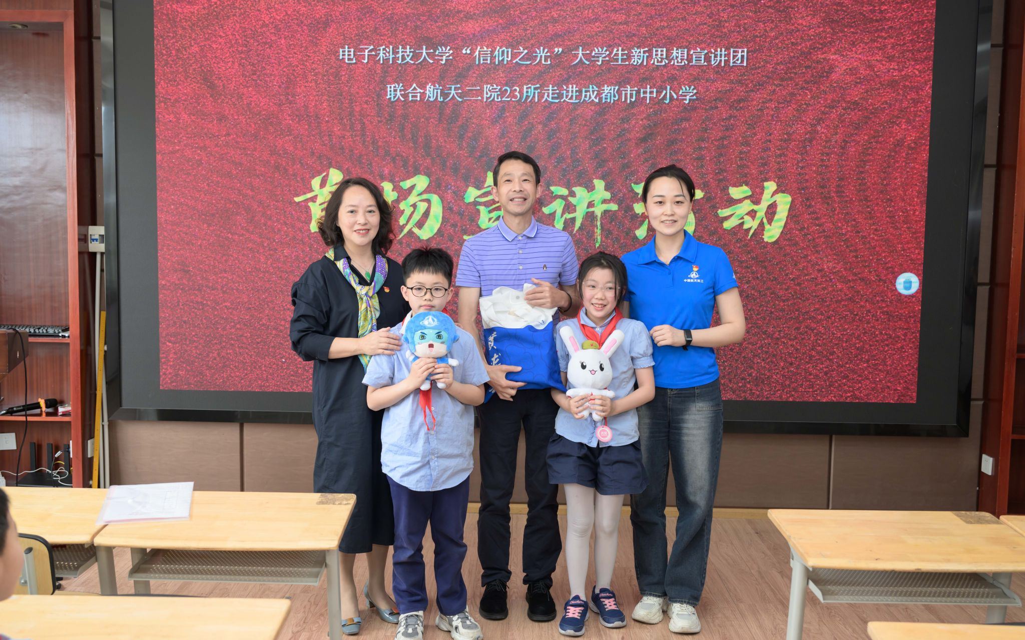 宣讲正式开始前,张琼和马博士分别代表电子科技大学和中国航天科工二院二十三所向成都市回民小学赠送礼物,陈绍光代表公司接受礼物。