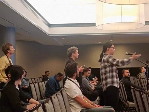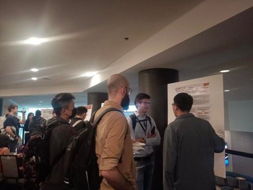 图2. 口头报告时同行进行积极交流(其中第二位为Mininet创始人Bob Lantz)