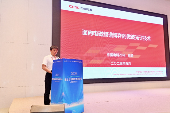 周涛研究员以“面向电磁频谱博弈的微波光子技术”为题,介绍了电磁频谱博弈和微波光子的有关概念和特点以及二十九所在微波光子领域取得的研究进展,并对该项创新技术在未来的发展路线做出了规划。
