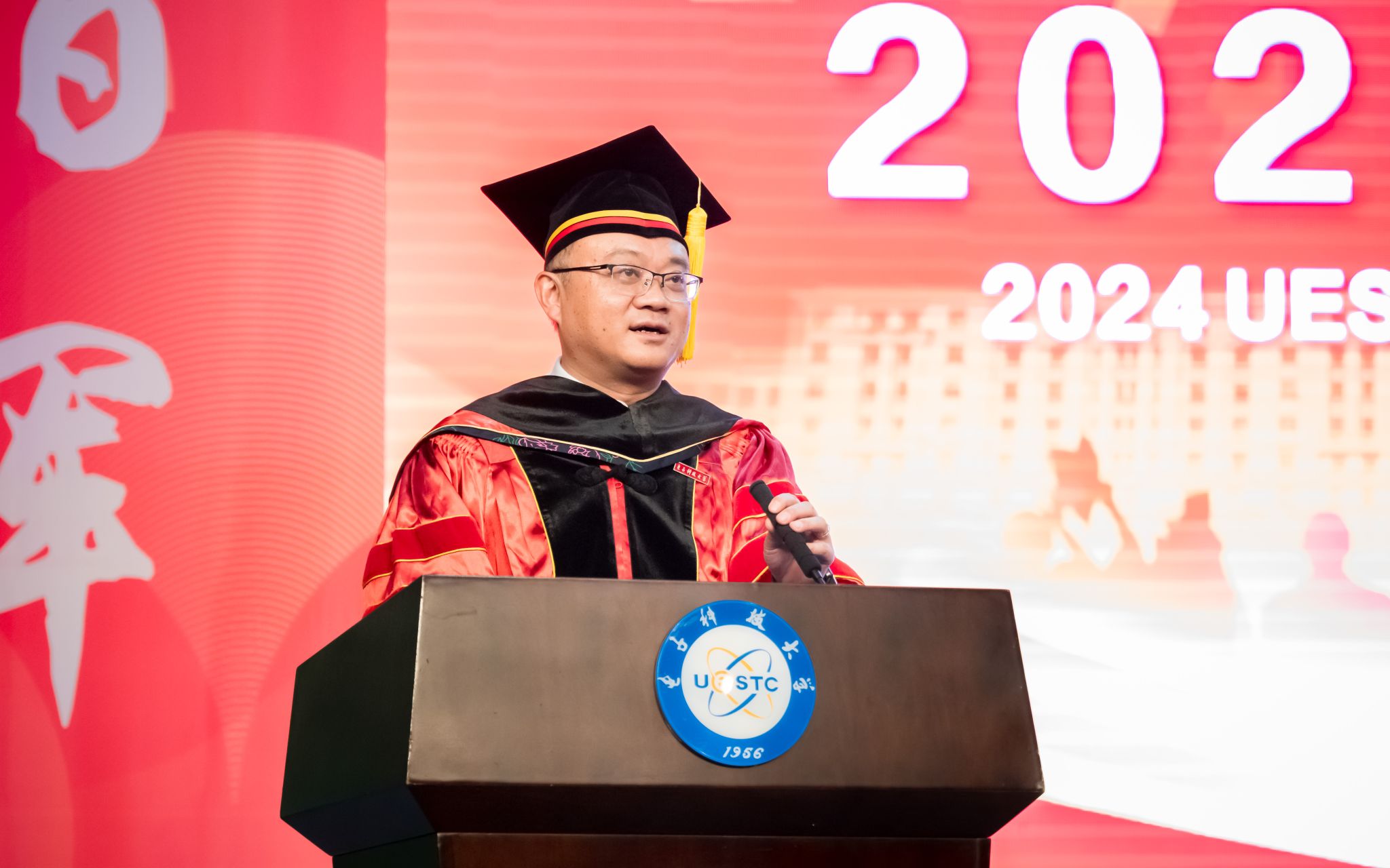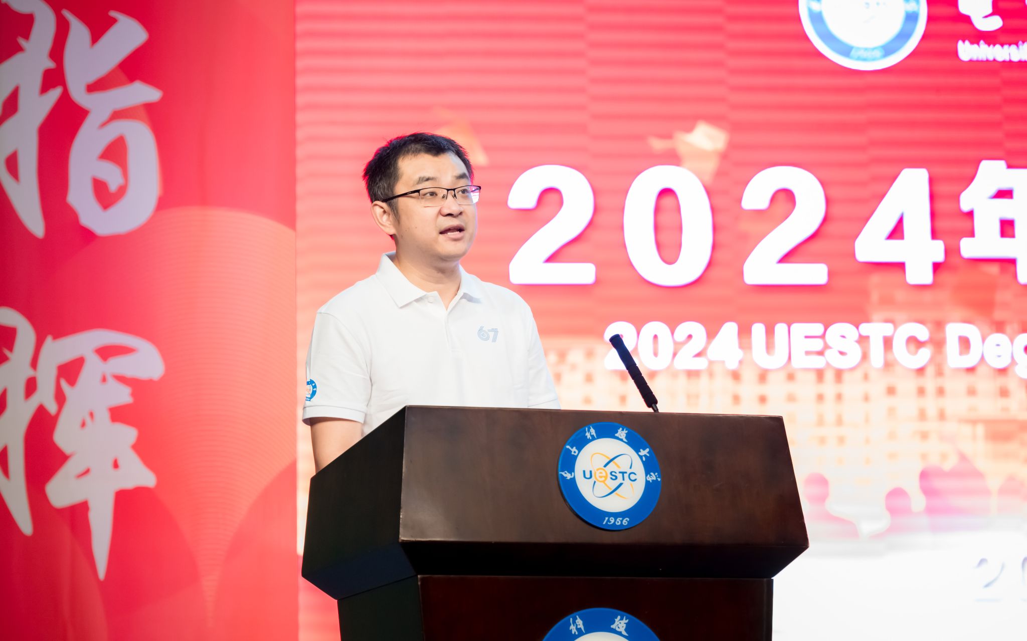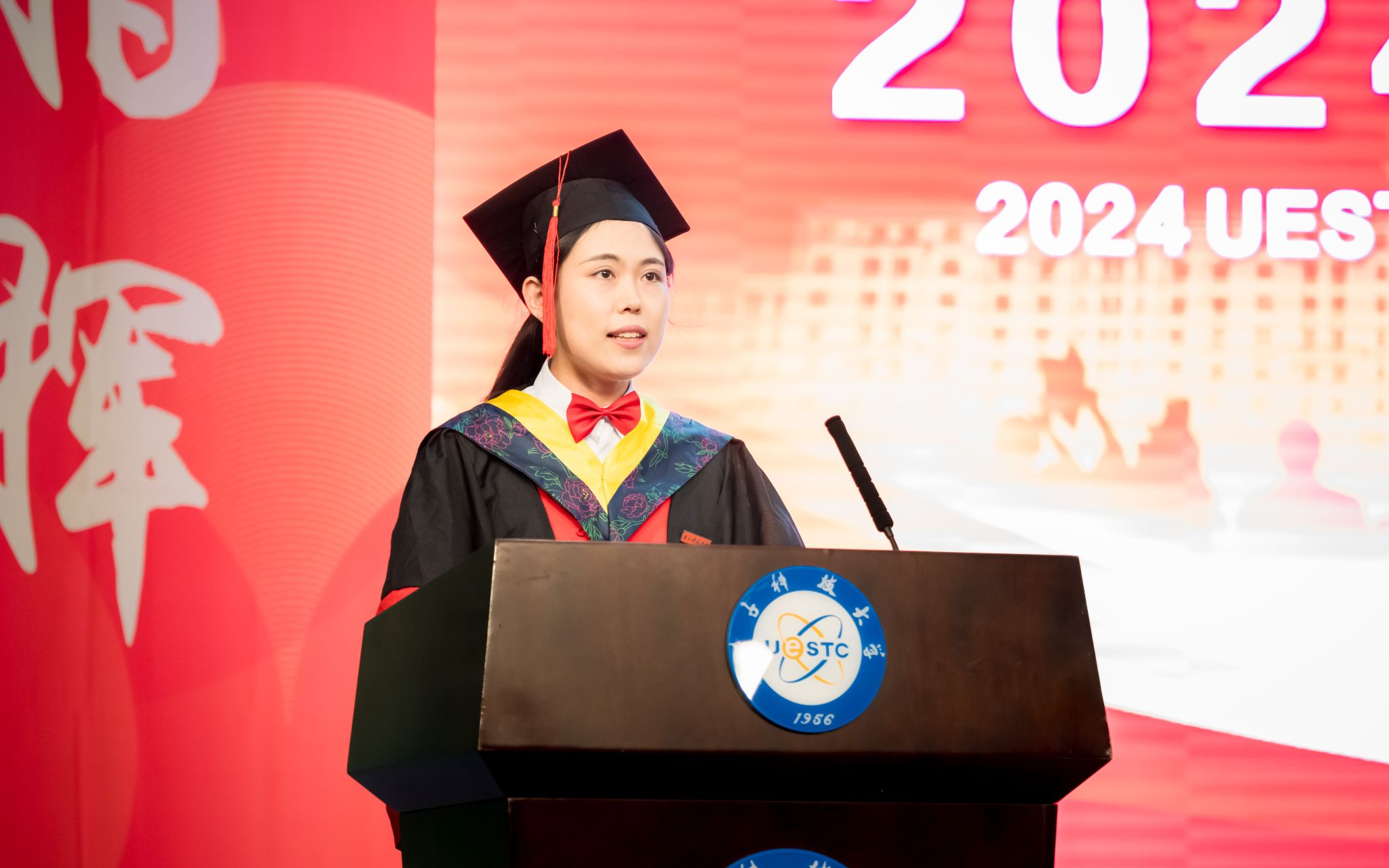 2023年度成电杰出员工、2024届博士研究生王岚晓同学作为毕业生代表发言。她以一名新时代青年学子的视角分享了自己的求学感悟和未来展望。同时强调了团队协作的重要性,希望学弟学妹们在科研的道路上不畏困难、勇往直前,胸怀梦想、为国担当,将个人发展与国家发展紧密结合。