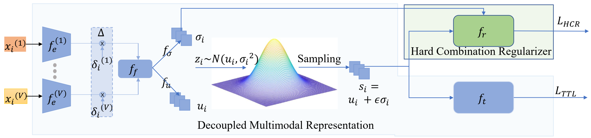 论文3 “Robust Multimodal Learning via Representation Decoupling” (ECCV2024录用)从理论上分析了解决模态缺失场景下的多模态表征学习问题。本文首次揭示了已有不完整多模态学习方法的类内表征方向约束问题,分析了其对机器学习模型在不同模态组合表征方面的具体限制。为此我们通过解耦训练表征和推理表征,提出了一个解耦多模态表征框架DMRNet (见图3)。DMRNet学习每个模态组合输入的分布,采样该分布的特征向量用于计算任务损失,然后将该分布的平均值作为用于推理的特征向量。因此,由损失最小化传回的方向约束被随机采样操作弱化,使模型能够为每个模态组合学习非平行推理特征,提高了模型的表征能力。相比于已有的基于知识嵌入的方法,所提出的框架不需要复杂的知识蒸馏过程,并且可以处理训练过程中的数据缺失问题,具有更广泛的应用场景。实验表明,所提出的DMRNet明显优于目前已有的方法。
