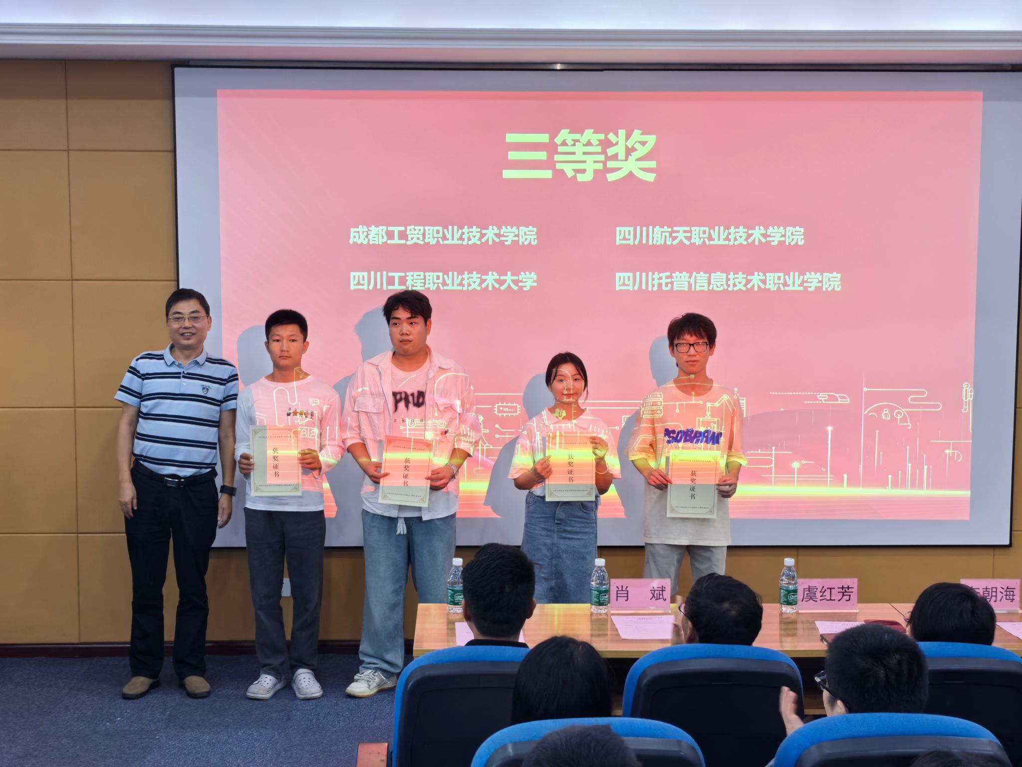 首先颁发的是省三等奖。来自成都工贸职业技术公司、四川航天职业技术公司等高校的优秀代表们逐一上台,他们的脸上洋溢着喜悦与自豪。颁奖嘉宾李朝海教授亲自为他们颁发证书与奖杯,并合影留念。这一刻,他们的努力与汗水化作了最灿烂的笑容,也激励着更多学子在电子设计的道路上不断前行。
