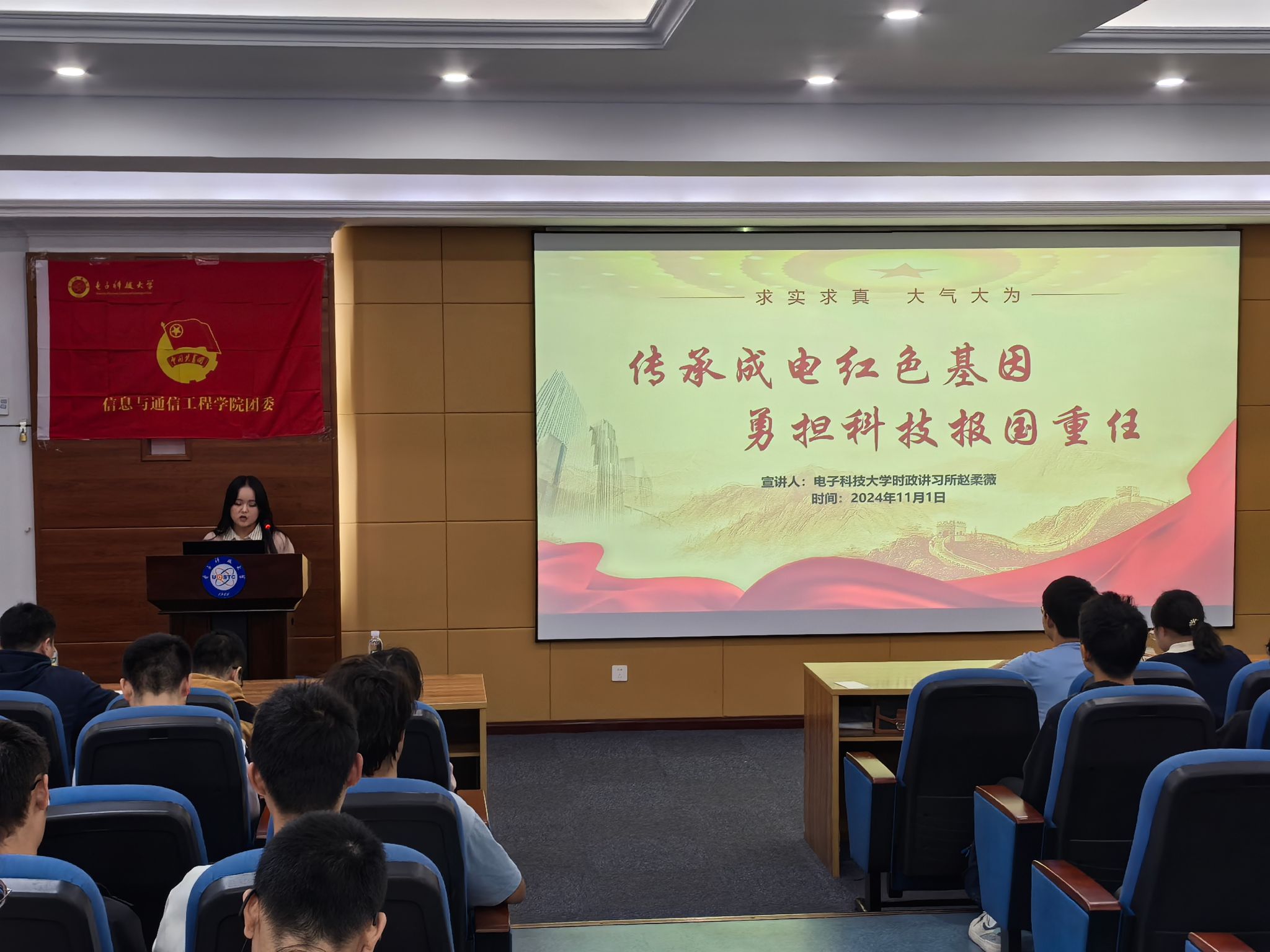 在整齐嘹亮的团歌声中,主题团日活动拉开帷幕。首先,马克思主义公司时政讲习所宣讲员赵柔薇作题为《传承成电红色基因,勇担科技报国重任》的主题宣讲。赵柔薇结合党的二十届三中全会精神,向大家介绍了《中共中央关于进一步全面深化改革 推进中国式现代化的决定》的主要内容。她通过一段影片介绍了众多老一辈科技工作者冲破重重阻碍,回到祖国怀抱的经历。优秀科学家们将投身科研攻关,促进科技发展作为价值追求与人生信念,他们的光荣事迹启发了同学们对科技报国的思考。