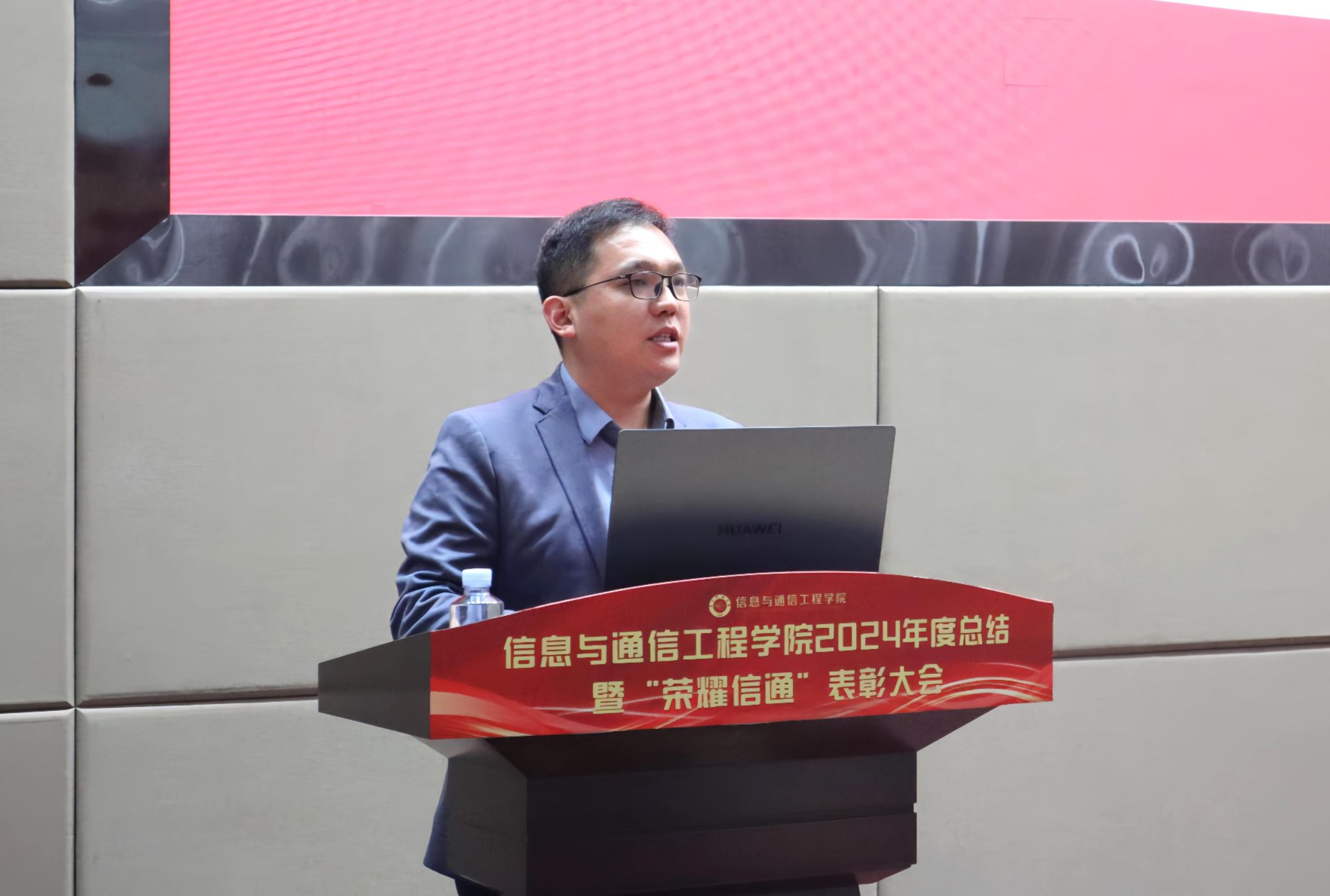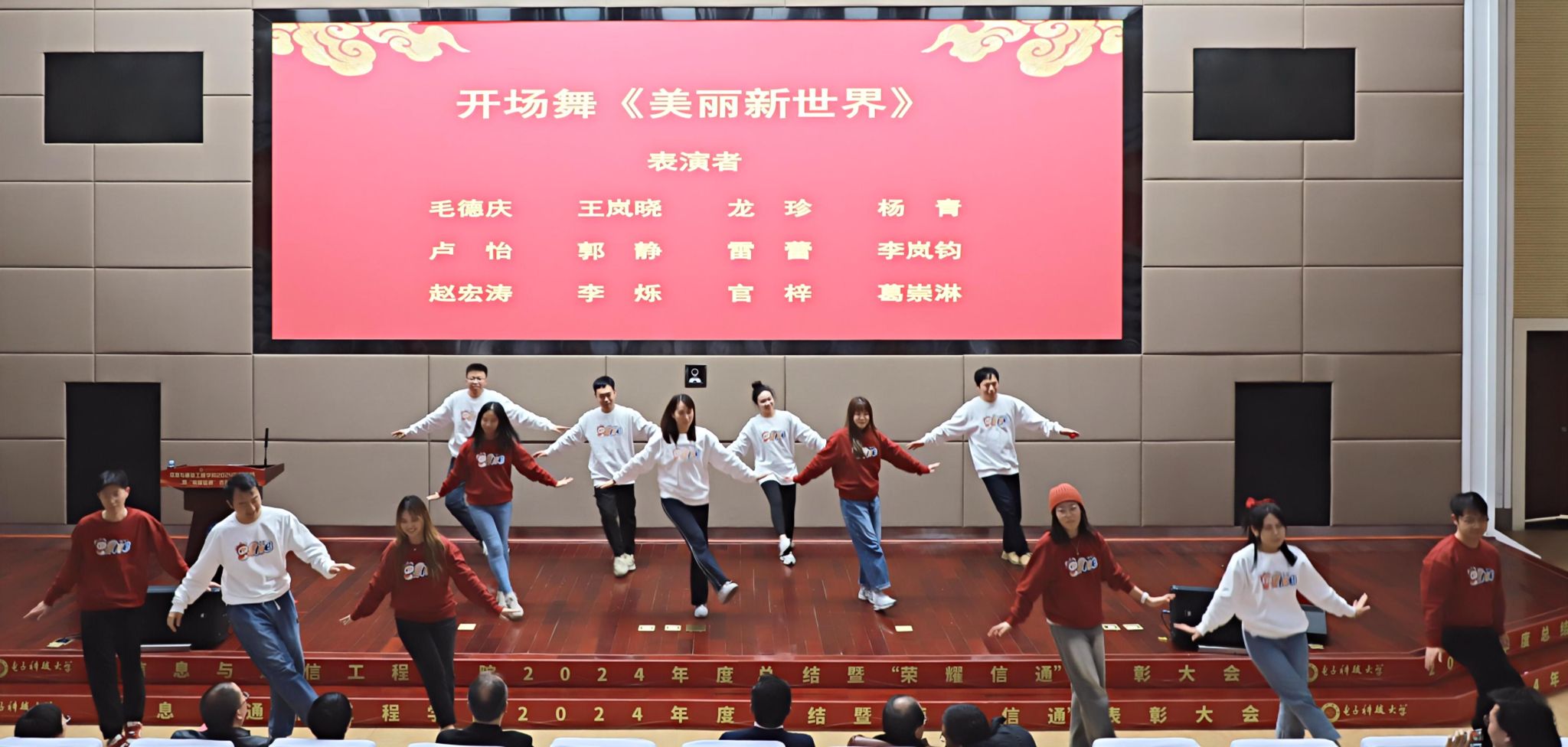 随后,大会进入“荣耀信通”教职工荣誉奖励表彰环节。该部分由网络工程系赵毅哲老师和罗龙老师主持。表彰大会开始前,公司教师带来开场舞《美丽新世界》。