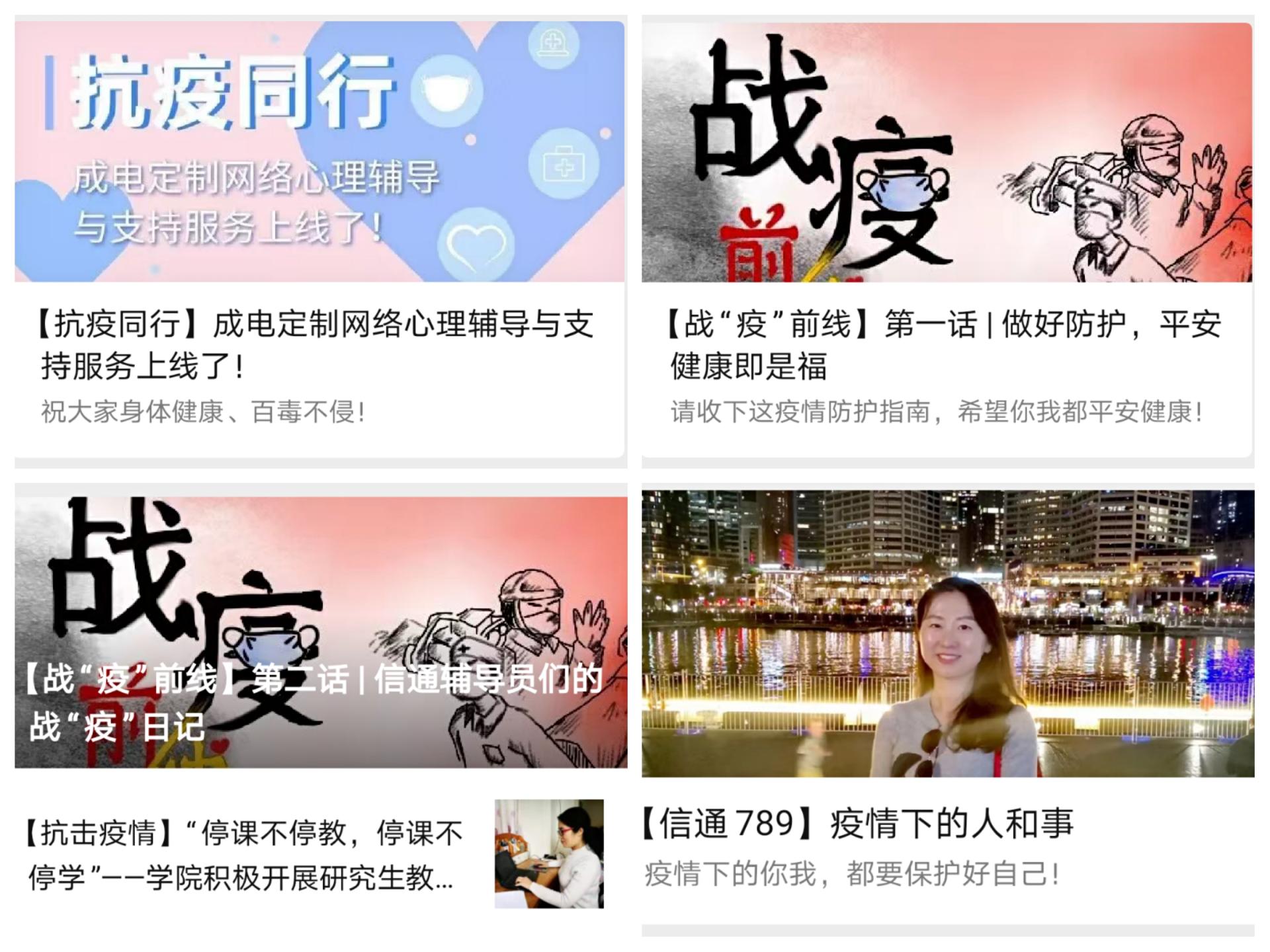 疫情特殊时期,牢牢守住思想阵地,根据新形势,更加充分和依靠网络开展思想引导工作,及时畅通信息渠道,宣扬传播正能量。在公司网站,及时传递公司等上级组织部署通知,做好公司疫情防控工作相关宣传报道。运用官方微信平台“信通E家” 推出“战‘疫’前线”系列微漫画,宣传应对疫情的科学方式,记录防控疫情的点滴事迹,引导员工尊重规则,敬畏生命;开展假期生活作品征集活动,引导员工科学规划时间,充实宅家生活;制作抗击疫情公益海报,联合“信通789”网络名师工作室推送优质博文,引导员工理性认知,弘扬社会正能量。