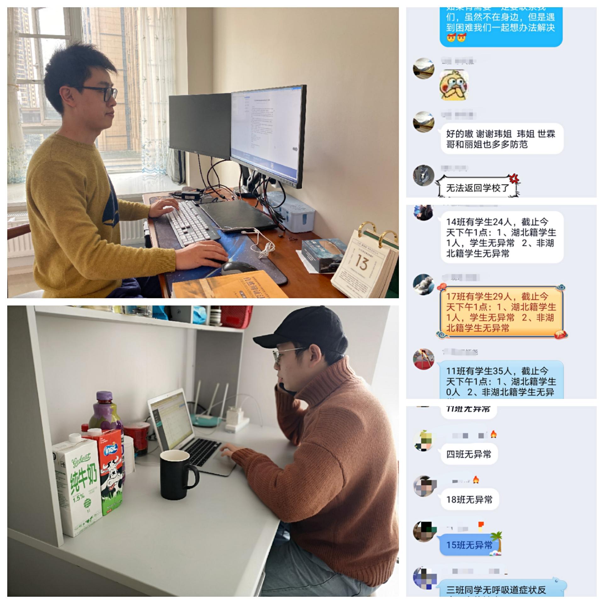 面对员工,辅导员第一时间行动起来,从休假进入“备战”,员工管理也从“面对面”进入“键对键”。辅导员密切关注和监测留校、回家、外出实习等员工群体的健康状况并做好记录;加强疫情防控时期职工的外文宣传,克服因语言带来的信息不对称;将公司防控方案与温馨提示点对点发给所有员工,与教务科、研究生科一同做好员工网上上课相关准备工作,提醒员工做好防护、不信谣、不传谣、不返校;组织员工骨干成立班级防疫线上工作小组,利用网上办事大厅和智慧学工打卡系统,实行员工“每日健康打卡”制度,全覆盖、不落一人,全面精准掌握全院5245名本科、研究生、职工等各类员工的情况;对湖北籍等重点关注员工建立一人一档,对填报异常、体温过高、打卡定位移动等员工每日电话联系,第一时间了解员工最新情况。