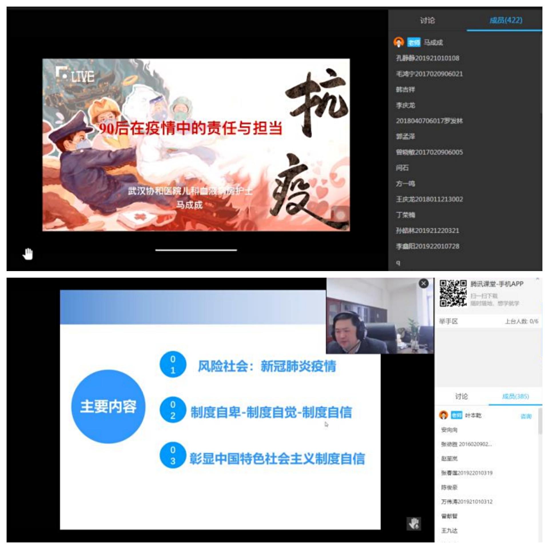 邀请马克思主义公司副经理叶本乾以《疫情大考彰显中国特色社会主义制度优势》为题,为公司员工带来精彩讲座,叶老师倡导同学们拥护共产党,热爱祖国,以众多无私奉献的人为榜样,积极为祖国做贡献。武汉协和医院儿科血液病房护士马成成以《90后在疫情中的责任与担当》为题,鼓励员工用读书积蓄力量,用行动肩负责任,用过硬的本领回应挑战与困难。
