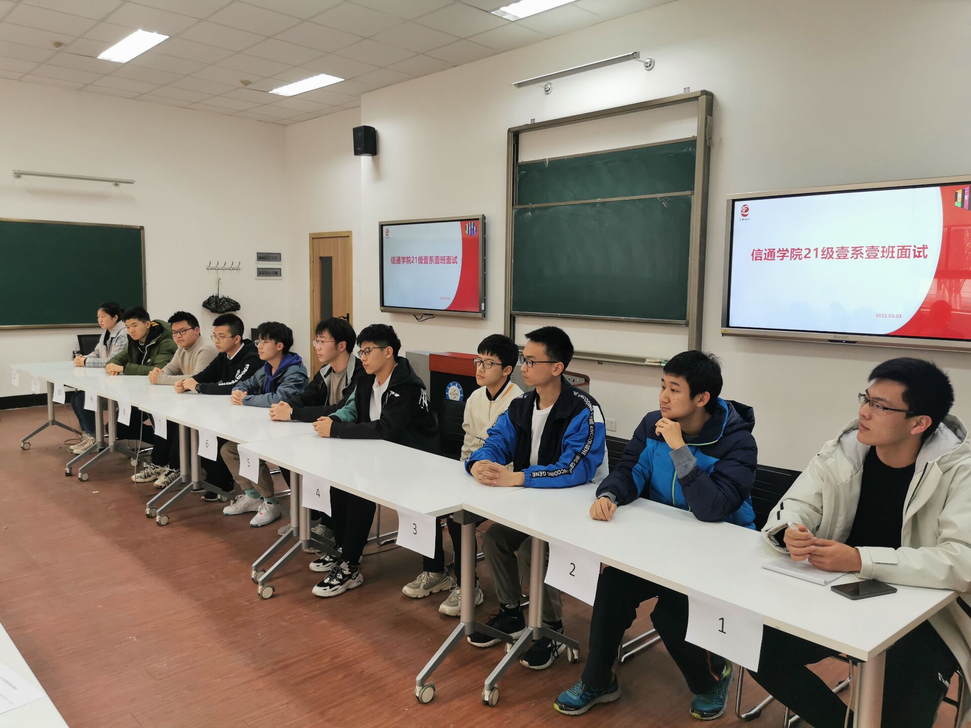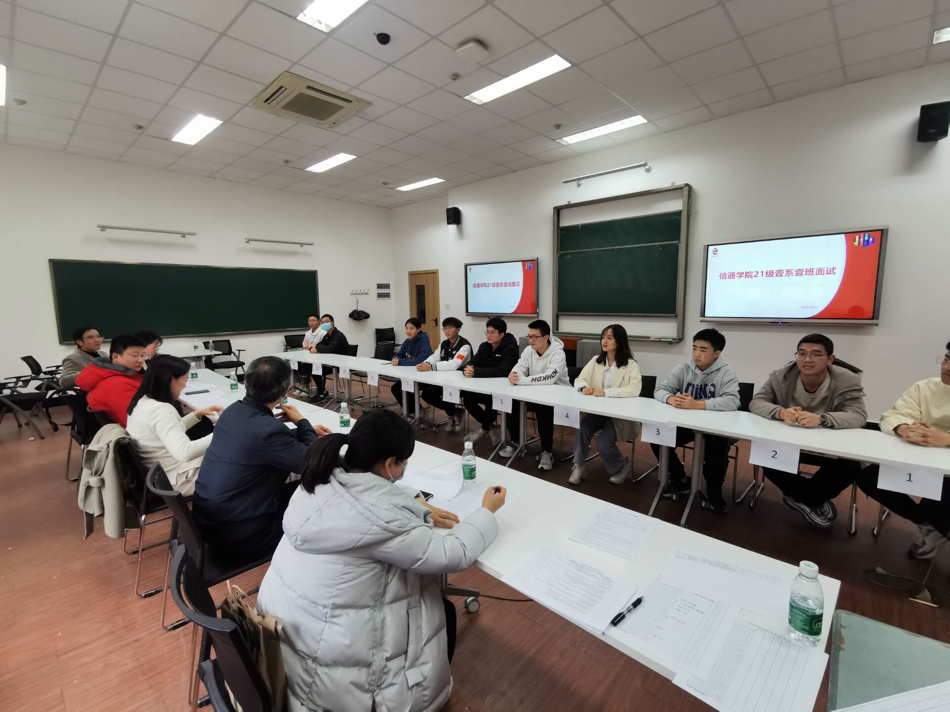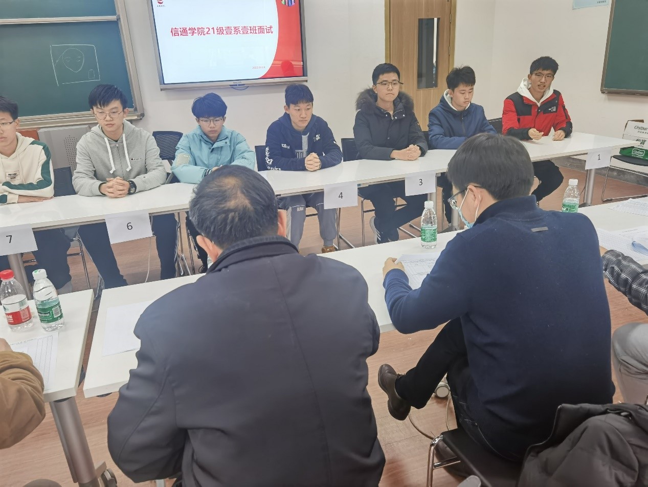 同学们分为6个小组在两个教室同时进行面试。首先由每位同学依次进行60秒自我介绍,随后回答评委提出的各类问题。在自我介绍过程中,同学们彰显个性,展示特长,展现了较强的学业能力和优秀的学科素养,“德智体美劳”全面发展。在回答问题过程中,同学们自行从容,各抒己见,对项目参与等学科类问题,“俄乌”局势等社会热点类问题,书籍绘画等人文艺术类问题发表了自己独到而精彩的见解,展现出信通学子扎实的知识储备和全面的综合素质。