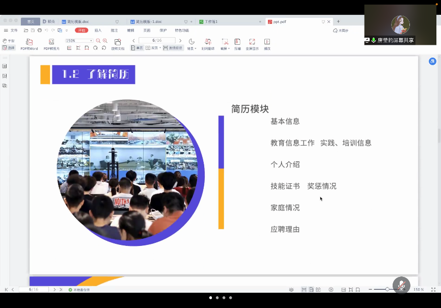而后,唐老师为我们详细介绍了在简历中企业想看到的信息,具体包括:基本信息、自我评价、教育工作信息、奖惩情况和应聘理由等,要对症下药,岗位对口能力匹配,注意内容不要有太多重复。