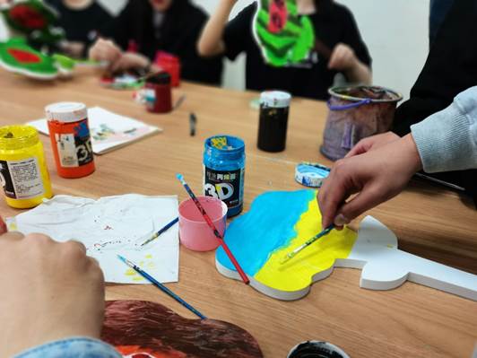 在绘画材料分发和创作主题确定后,怀着憧憬与热情,同学们以不同的农作物为创意出发点,在木板上畅意绘画。