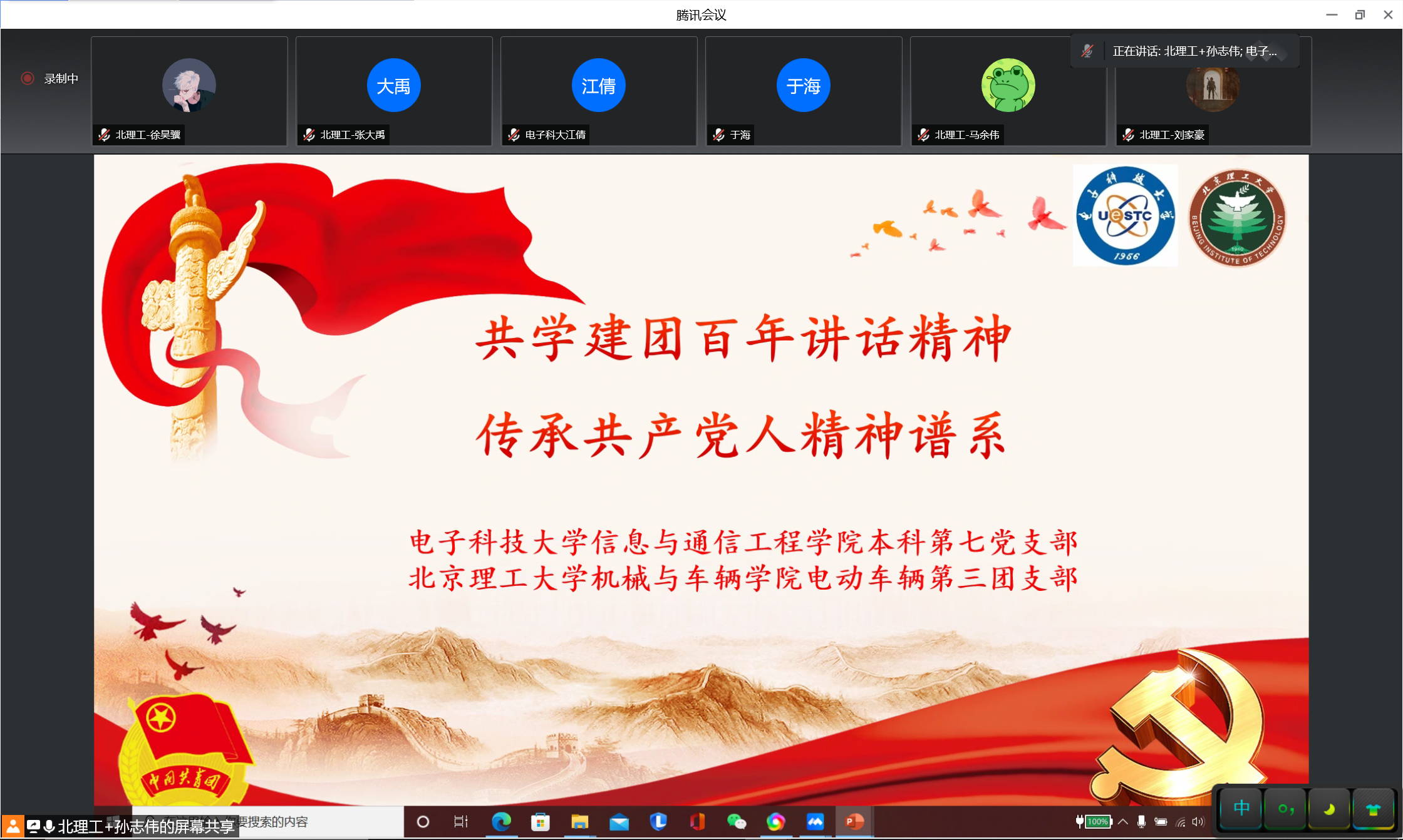 5月24日,伟德国际victor1946本科第七党支部与北京理工大学机械与车辆公司电动车辆第三团支部举行“共学建团百年讲话精神,传承共产党人精神谱系”党团联学共建活动。北理工机车公司团委书记郝佳馨、副书记魏瑶,伟德国际victor1946员工科科长江倩、辅导员徐展参加活动。电子科技大学伟德国际victor1946与北京理工大学机车公司均为全国党建工作标杆院系,本次活动采用线上线下结合的方式,由北理工机车公司电车三团支书孙志伟主持。