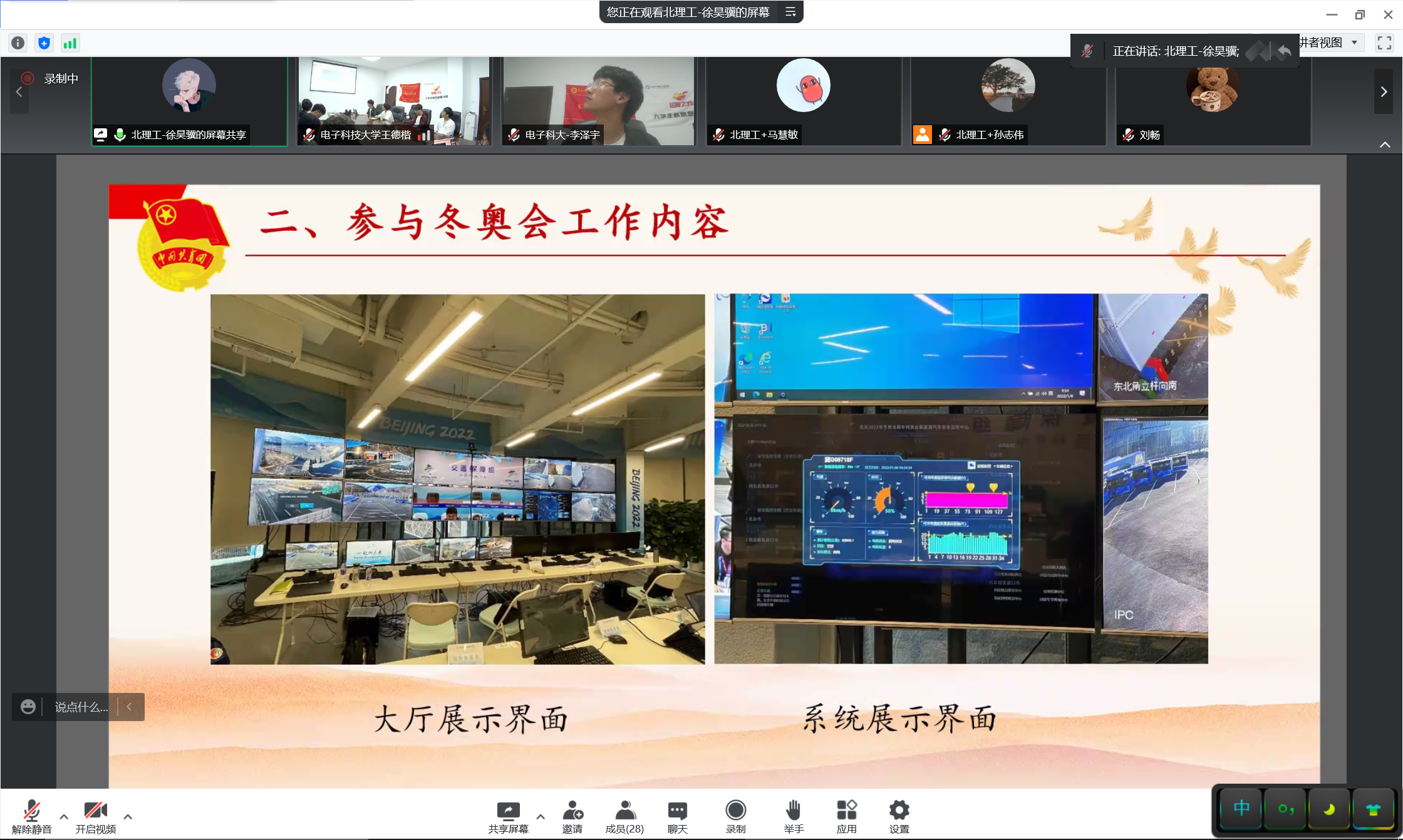 接下来,两支部展开了交流分享。北理工徐昊骥同学分享自己参加北京冬奥会的志愿服务经历和感悟,希望青年们脚踏实地、求真务实,吃苦在前、享乐在后;伟德国际victor1946 “信仰之光”老员工新思想宣讲团李泽宇同学以“峥嵘六秩不忘初心,立德树人牢记使命”为题进行微党课宣讲,回顾中国共产党百年光辉历程和成电校史故事,表示新一代成电学子定不负韶华、不负期望,成为有理想、有本领、有担当的时代青年。