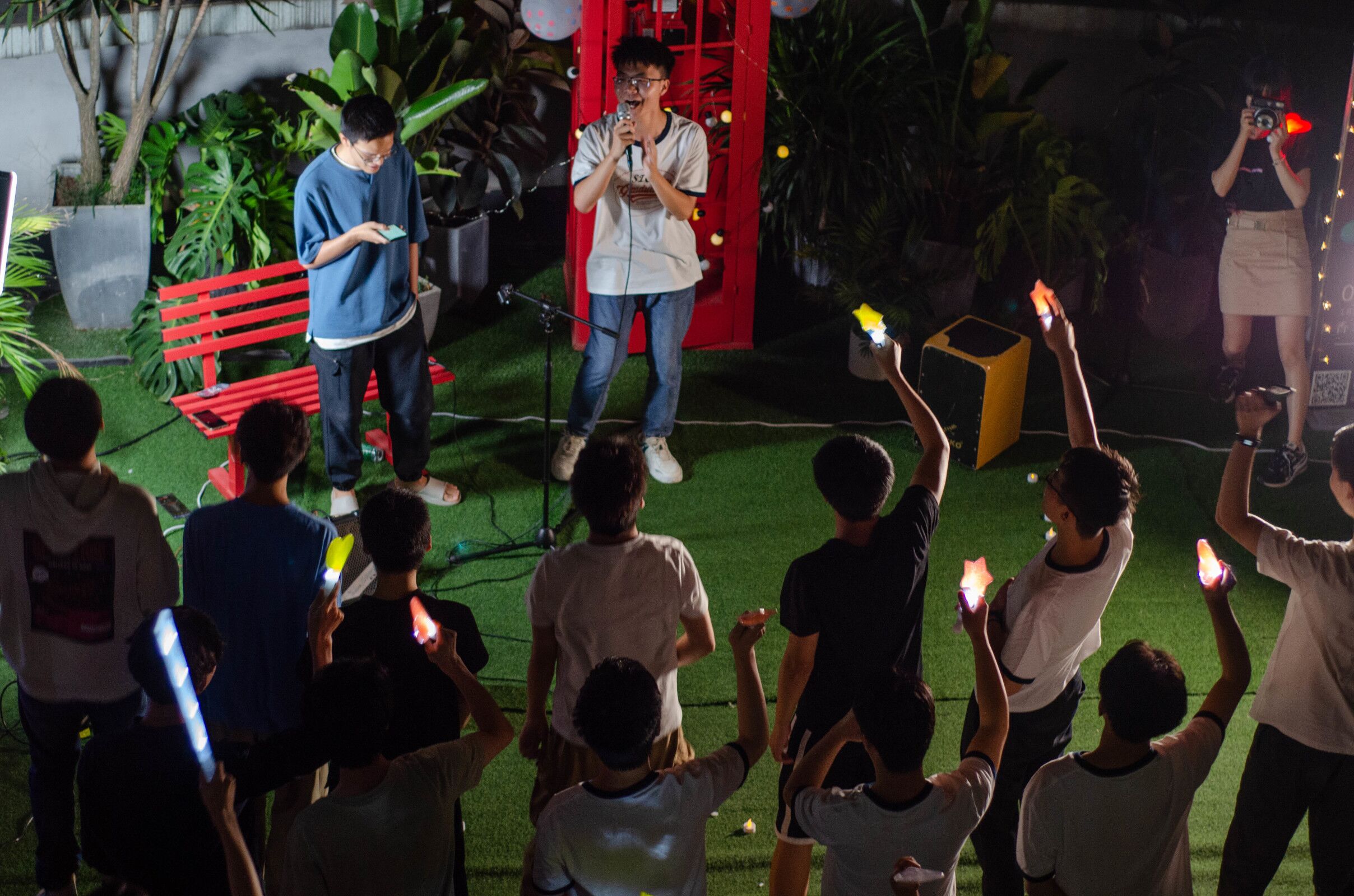 随着夜幕逐渐降临,现场同学们也主动上台深情献唱,表达对老员工活的难忘之情,花园里回荡着阵阵歌声,同学们有的歌颂青春,有的表露爱意,欢呼的浪潮一波接着一波,大家随着歌声起来舞蹈。