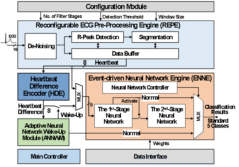 此外,团队延续了2021年在芯片领域顶级会议ISSCC上发表的超低功耗心电AI处理芯片工作。提出了一种基于用户心拍的差分心电识别技术,降低了用户个体差异对分类性能的影响,提高了准确率,同时降低了处理功耗。同时,提出了基于内嵌的两级神经网络,进一步降低了事件驱动AI处理功耗。在此基础上,还提出了自适应神经网络唤醒模块,显著降低了神经网络处理引擎的开启频率,进一步降低了处理功耗。该芯片采用55nm CMOS工艺流片,芯片面积仅为0.92mm2,在国际标准心电数据集MIT-BIH上对心律不齐分类准确率为98.7%,单个心拍分类能耗仅为0.09微焦,为目前国际上最低。