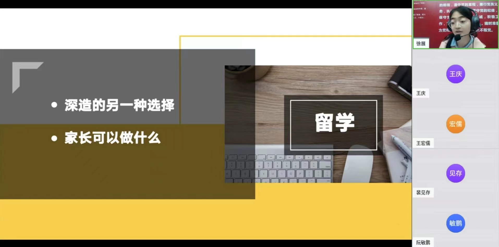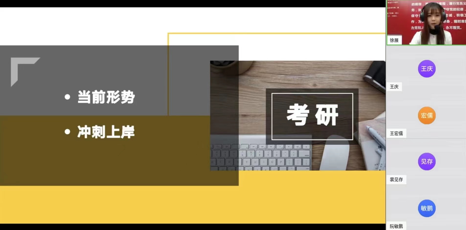随后,年级辅导员徐展为家长们介绍了现阶段考研的基本情况,从全国考研整体趋势到本公司近年应届生考研情况和今年面临的几大变化进行分析,建议家长在员工备战考研的冲刺阶段给予鼓励和包容,同时结合孩子自身和家庭实际,理性决定毕业去向。