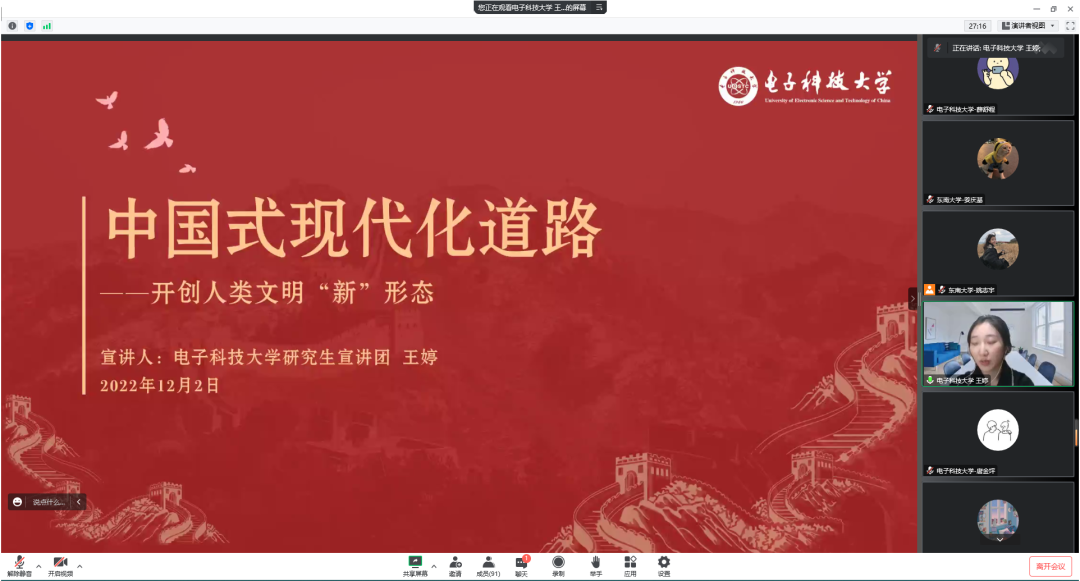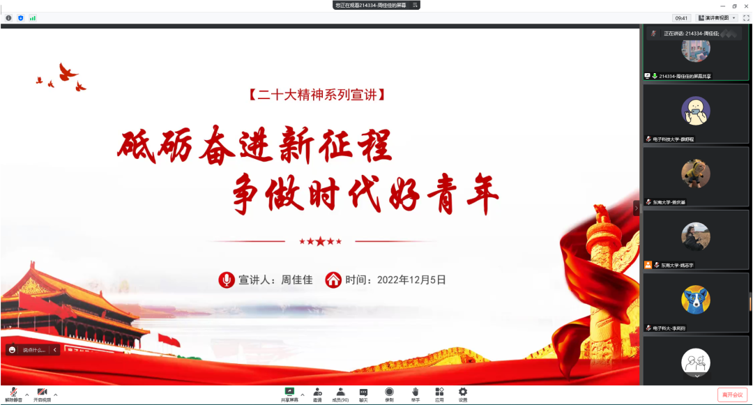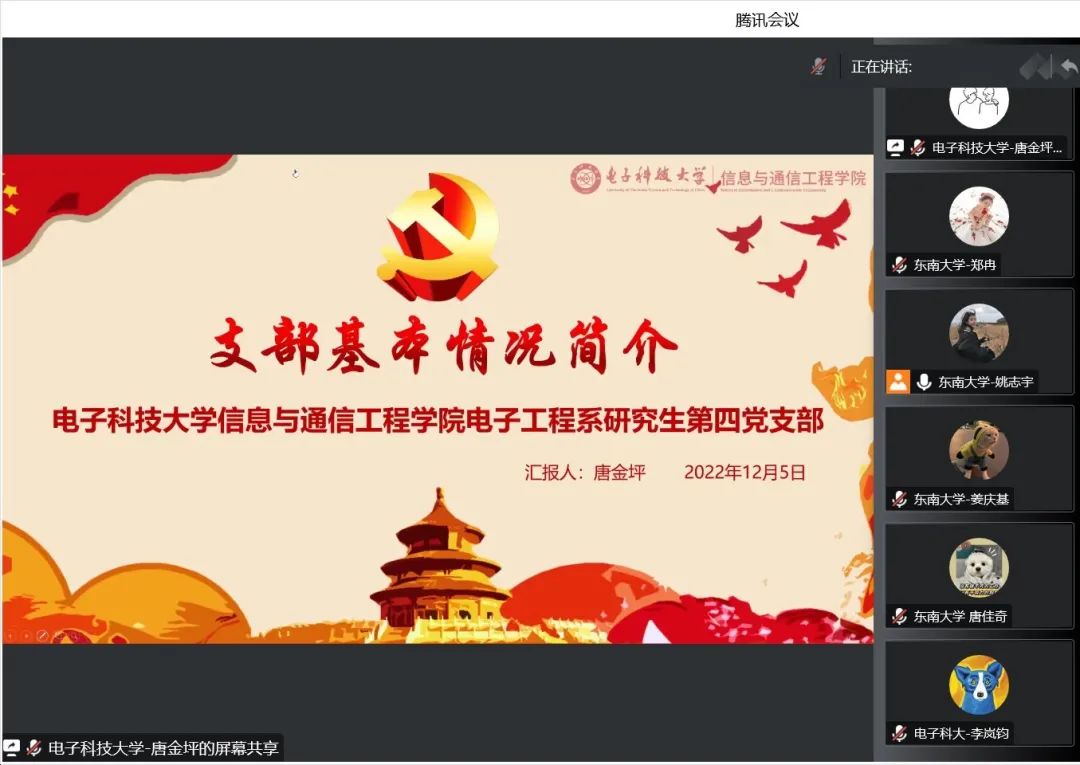 2022年12月5日,电子科技大学伟德国际victor1946电子工程系研究生第四党支部联合东南大学无锡校区信息硕士第四党支部共同开展“同心共建聚合力,支部联学二十大”主题党日活动,探索院校员工党支部学习交流新模式。电子科技大学伟德国际victor1946辅导员李岚钧、东南大学无锡校区党务秘书、信息21级硕士辅导员唐佳奇、电子科技大学研究生宣讲团王婷、东南大学研究生讲师团周佳佳线上出席,电子科技大学伟德国际victor1946电子工程系研究生第四党支部、东南大学无锡校区信息硕士第四党支部全体党员共计90余人参加本次主题党日活动。