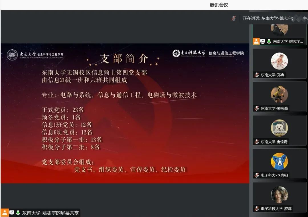 东南大学无锡校区信息硕士第四党支部党员李莎说:“此次共建活动让我了解到了东南大学与电子科技大学两校的深刻的历史渊源,两支部成员研究方向虽有不同,但都属于未来国家高精尖技术领域,有着良好的合作基础。在今后的活动中,我会利用好支部共建活动的机会,与电子科技大学的同学们充分交流,开拓思维、取长补短、携手共进。通过学习此次二十大系列党课,我深刻领悟到作为一名信息公司的硕士生,应该要扎实掌握专业知识,切实提高科研能力,同时进一步提高服务国家重大战略需求的自觉,坚定听党指挥跟党走的信念与信心。”