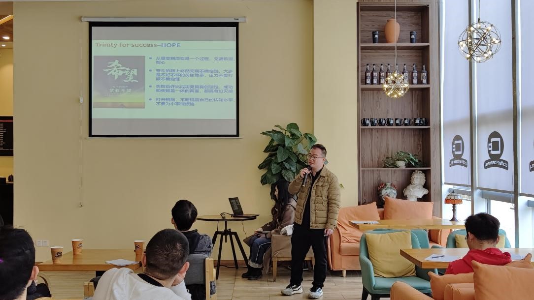 首先,蒋文师兄介绍了自己的学习和工作经历,然后从“Connected to dots”、“Trinity of Success”、“Some Suggestions”这三个方面进行讲述。他介绍到要学会把自己在学习、工作和生活中所获得的资源相互联结,形成自己特有的认知和看法,并且保持直觉和好奇心不断前行。之后又提出了自己取得成功的三要素,即希望、奋斗和热爱。最后他从科研、团队关系、人生选择这三方面给同学们提供了一些实用的建议。