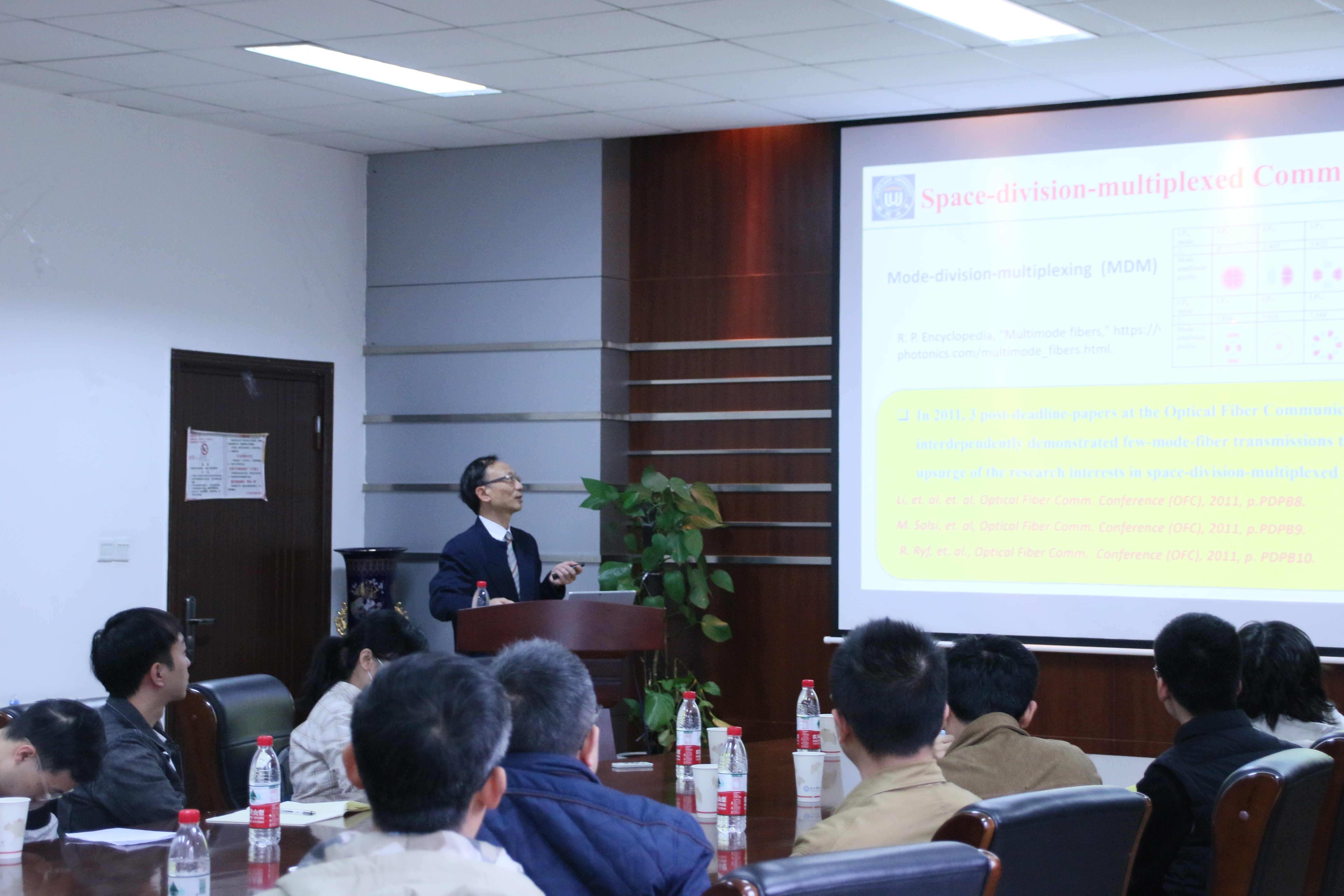 在交流环节中,谢伟教授解答了关于少模通信空分复用技术中解调的复杂性、自相干以及直接检测下的光场恢复等问题,给师生解决科研问题并给出建议。