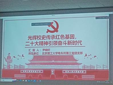 “追溯光辉校史,传承红色基因”,北京理工大学电车所第三团支部的尹晓轩同学以此为主题,带领大家对党的二十大精神进行深入学习,号召大家在新时代努力奋斗,争当新青年,绽放绚丽之花。