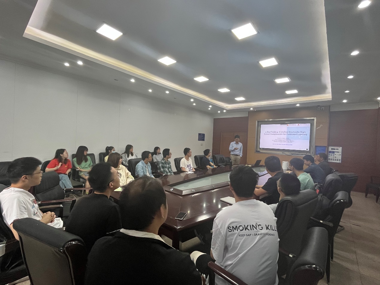 参会师生与张纵辉副教授围绕联邦学习的随机符号压缩方案等展开了热烈讨论。部分参会研究生表示,本次讲座内涵丰富,加深了其对基础科研研究的兴趣。最后,大家合影留念。