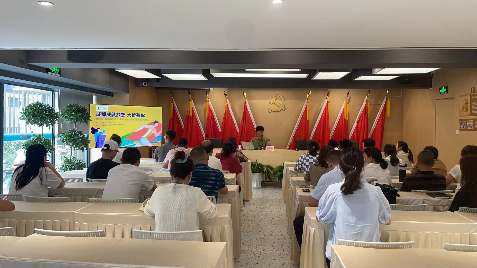 5月18日,为进一步营造“爱成都·迎大运”的浓厚氛围,向全民推广大运知识、传递大运精神,伟德国际victor1946“信仰之光”老员工新思想宣讲团成员赵苇航走进成都市社区基层,代表成都大运会青春宣讲团以“践行青春志愿 共赴大运盛会”为题面向东安街道40余名党员代表、居民代表开展宣讲。