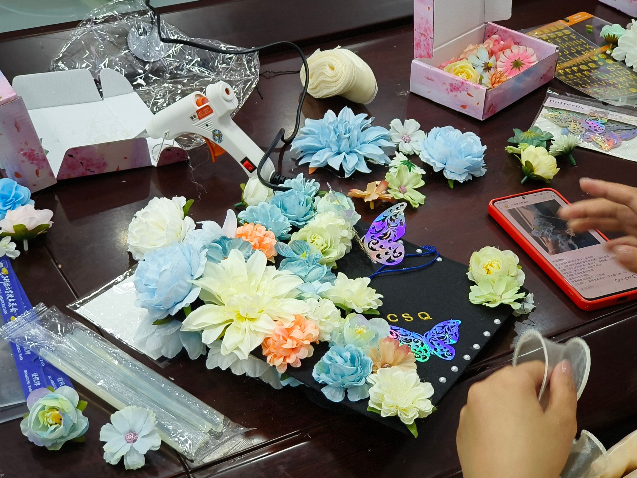 在现场,伴随着初夏的微风,同学们挑选着色彩斑斓的簪花、流苏和蝴蝶,用热熔胶将它们巧妙地点缀在学位帽上。他们以帽为“纸”,以花为“笔”,设计出属于自己的独一无二的学位帽。蝴蝶驻足在帽檐,仿佛正要翩翩起舞;花朵盛开在指尖,象征着同学们这一路走来的累累硕果。每个人都沉浸在创作的喜悦中,感受到手工制作的乐趣和成就感。