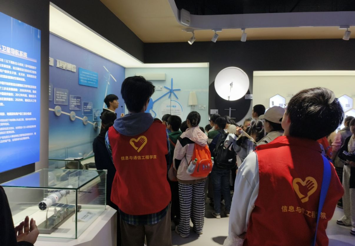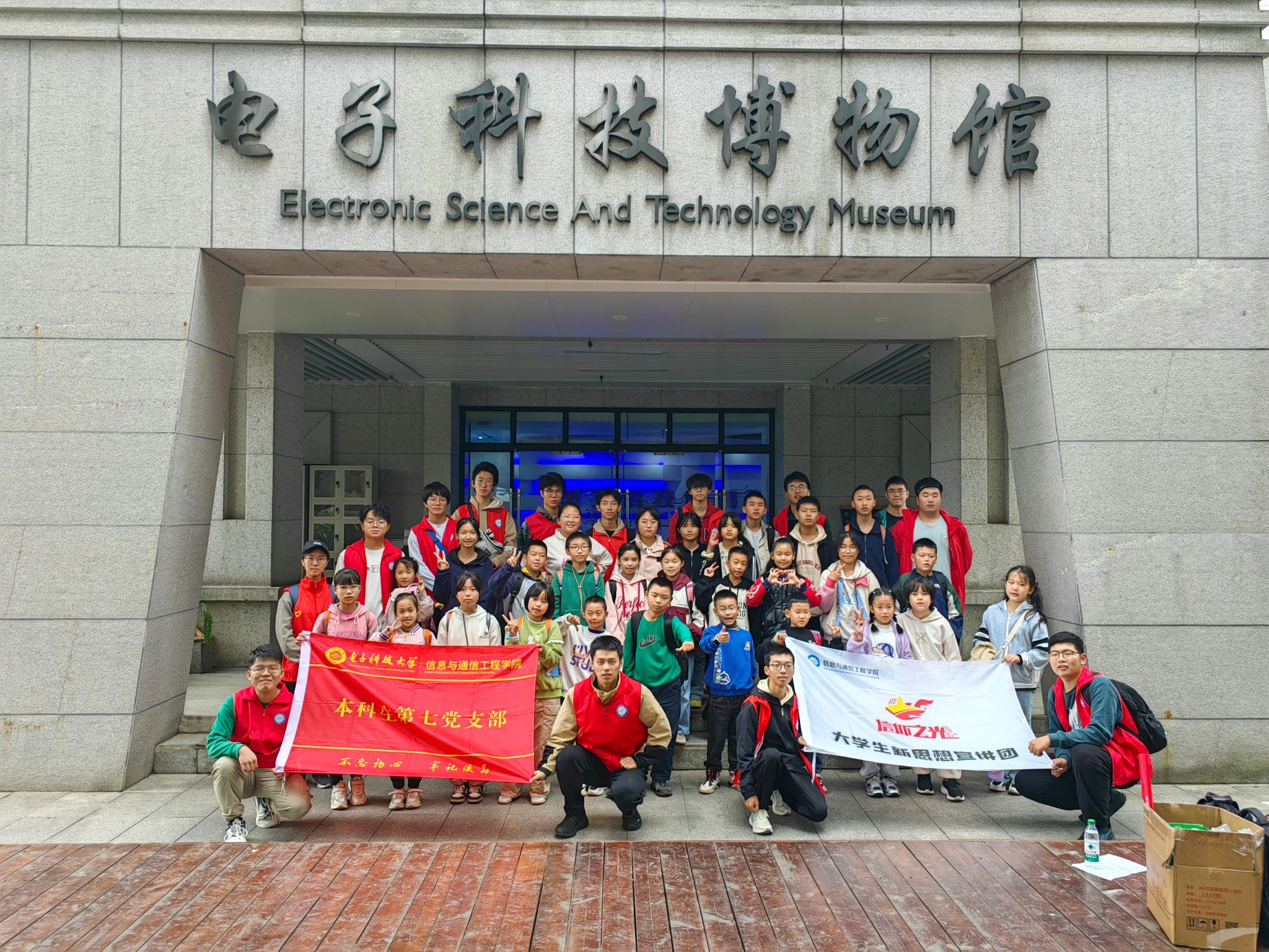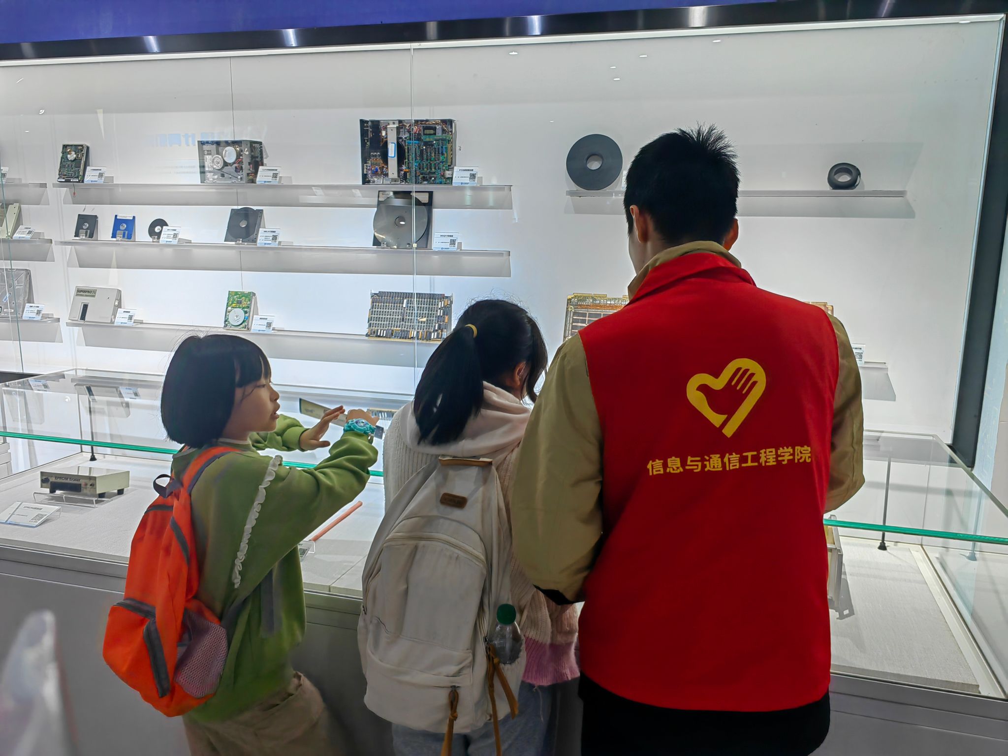 活动的第一站是电子科技大学博物馆,众多展品详细记录着早期通信技术的发展演变,也讲述了现代通信设备迭代更新的故事,整个博物馆充满了科技和创新的气息。在博物馆里,第七党支部成员马海宇、郝晟博结合所学知识,向孩子们讲述了许多历史上具有里程碑意义的通讯设备和技术成果。