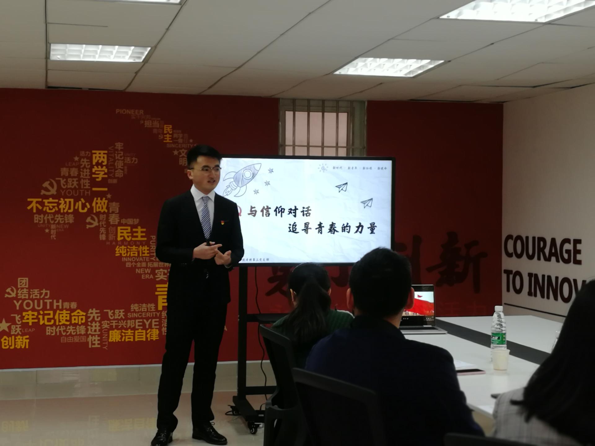 本科第三党支部书记单晓龙以“与信仰对话,追寻青春的力量”为题向同学们讲述了习近平总书记在梁家河的曲折的七年知青岁月。他在报告中提到,正是这七年的知青生活奠定了习总书记治国理政的鲜明的基调:重视基层工作,把人民放在心中最高的地位。他说,中国目前有两亿四千万农民工,九百万留守儿童,他们的福祉关系到我们党和国家的建设成果,到基层听民声、解民意,为广大人民群众排忧解难,是我们党长期应该坚持的工作方针。他鼓励同学们以习近平总书记为学习榜样,爱国、励志、求真、力行,通过政治思想学习最大化发掘个人价值的中心点。