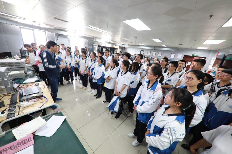 上午9点,简阳中学师生准时来到清水河校区,同学们首先来到通信抗干扰技术国家级重点实验室参观,实验室邹显炳老师用质朴的语言为同学们描述了一场通信技术变革的历史:从2G时代的追赶,3G4G时代的跟随,到5G时代的引领,一代又一代科学家和工程师们做出了非常大的努力。在听到抗干扰实验室与华为合作研制的短码标准成为国际标准的时候,员工们深深地为我国的科技力量所折服。