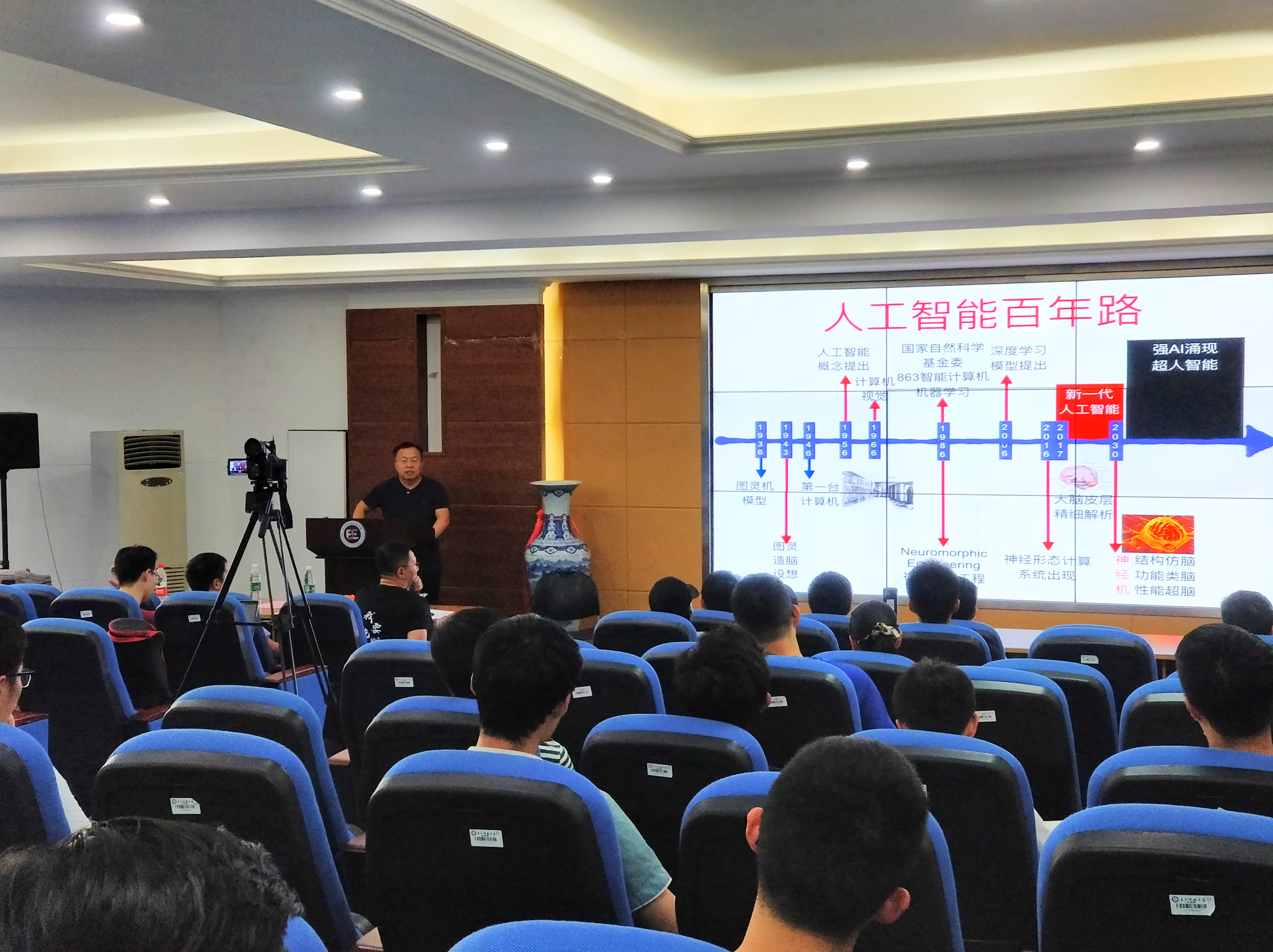 讲座伊始,黄铁军教授先带大家回顾了人工智能六十年的发展历程,并对未来人工智能发展趋势做出了预测。他认为虽然现在人工智能十分热门,但大多数人却不了解什么才是真正的人工智能。他讲到:“真正的人工智能,是以机器为载体的智能,是相对于人类智能和动物智能的一种机器智能。”通过引入图灵在1936年对人工智能的思考,他指出真正想要实现人工智能不光需要在软件层面研究人工智能算法,更重要的是要对硬件结构进行改变,这也是他所从事类脑计算研究的原因之一。