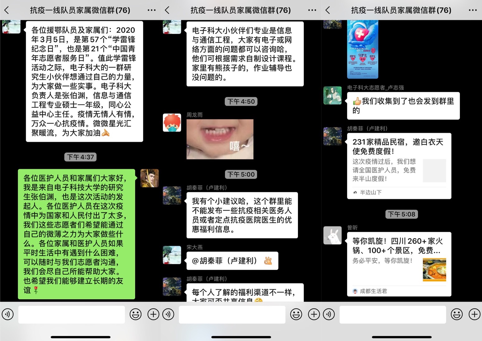 公司志愿者为成都363医院赴鄂抗疫,以及赴藏、赴成都卫健委支援的医护人员及家属提供帮助,奉献微薄之力,为逆行者加油,做逆行者的后备军。志愿者分配到户,征集留川家属的需求,开展形式多样的服务,如:代买生活物资、代办日常事务、员工功课辅导、心理辅导等。活动中,志愿者们组建了志愿者服务群和家属交流群,一方面不断总结工作,提升工作质量;一方面及时更新家属服务需求,力求满足家属所需。