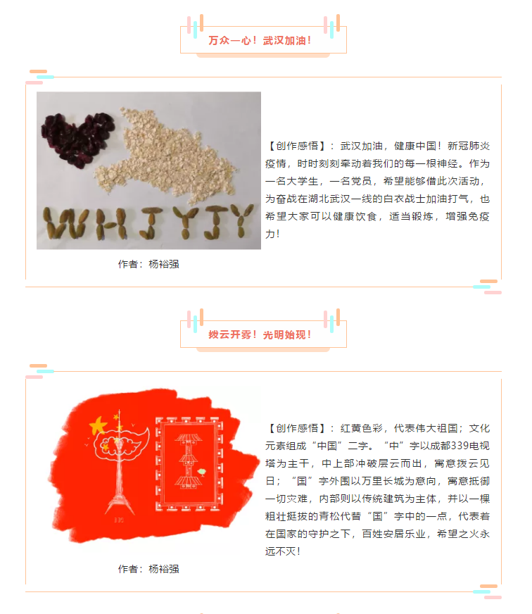 为深入学习宣传贯彻落实《新时代爱国主义教育实施纲要》,切实将共同抗击疫情斗争作为推进高校思想政治教育的重要实践和生动教材,伟德国际victor1946积极部署开展“共抗疫情、爱国力行”主题宣传教育,倾力推出本科党支部“共抒爱国情,网聚正能量”线上党日活动接力展示,青年党员们将通过“读”“写”“拍”“画”“创”等形式,用自己的视角、自己的语言、自己的体验、自己的方式进行网络创作,大力弘扬新时代爱国主义精神、不断坚定爱国力行的使命责任。