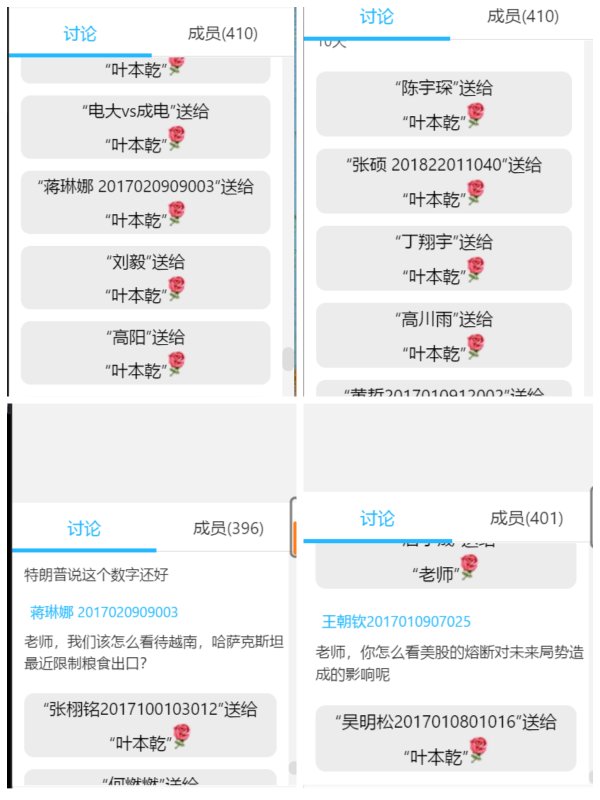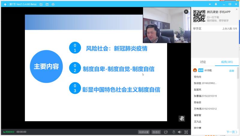 随后,叶老师从制度方面,分析了中国由传统的制度自卑到制度自觉再到如今站起来-富起来-强起来的制度自信,并且从多方面讲述中国特色社会主义制度在这场疫情大考当中发挥的重要作用,指出中国特色社会主义制度和国家治理体系是具有强大生命力和巨大优越性的,能够持续推动中国进步和发展,确保中华民族实现“两个一百年”奋斗目标进而实现伟大复兴的制度和治理体系,并倡导同学们拥护共产党,热爱祖国,以众多无私奉献的人为榜样,积极为祖国做贡献。