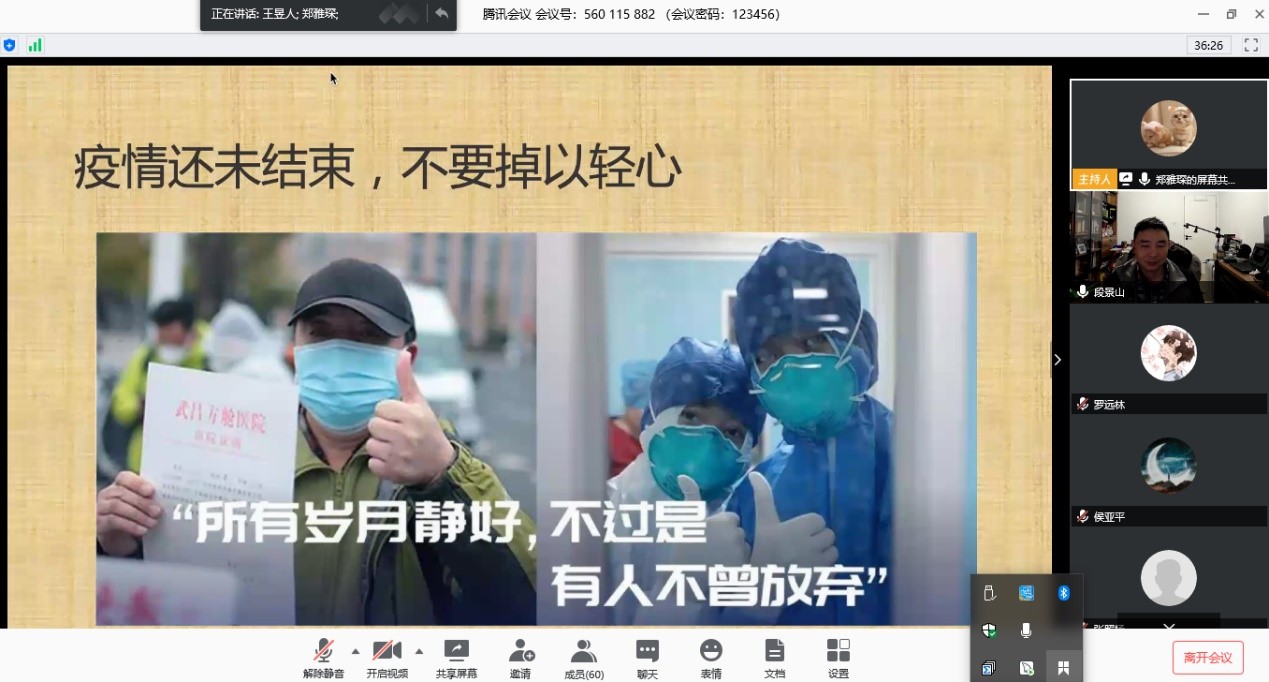教工党员代表冷甦鹏老师首先从国内外疫情防控工作对比中指出中国特色社会主义制度的先进性和优越性,对研究生同志目前的学习、生活和科研表达了关心,并给出了一些针对性的建议。段景山老师表示此次疫情是对我国国家治理体系和治理能力的一次大考,疫情防控工作充分体现全国一盘棋,集中力量办大事的显著优势。随后,与会同志通过交流分享和PPT展示的形式,学习了习近平主席在北京出席二十国集团领导人应对新冠肺炎特别峰会并发表的题为《携手抗疫 共克时艰》重要讲话,习近平主席就会议议题提出4点倡议,包括“坚决打好新冠肺炎疫情防控全球阻击战、有效开展国际联防联控、积极支持国际组织发挥作用、加强国际宏观经济政策协调”等。郑雅琛同志强调目前中国国内疫情防控形势持续向好,生产生活秩序加快恢复,但仍然丝毫不能放松警惕。