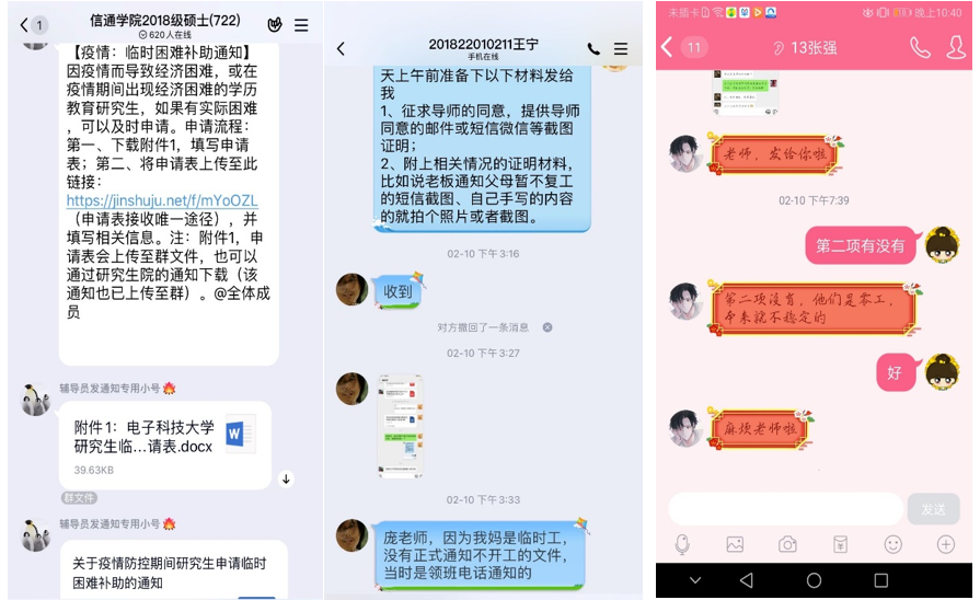 为帮助受新型冠状病毒感染肺炎疫情影响导致经济困难的同学,解决他们在学习、生活中遇到的经济困难,公司落实研究生院印发的《关于疫情防控期间研究生申请临时困难补助的通知》精神。自收到通知起即对全院研究生同学进行宣传转达,介绍申请流程。