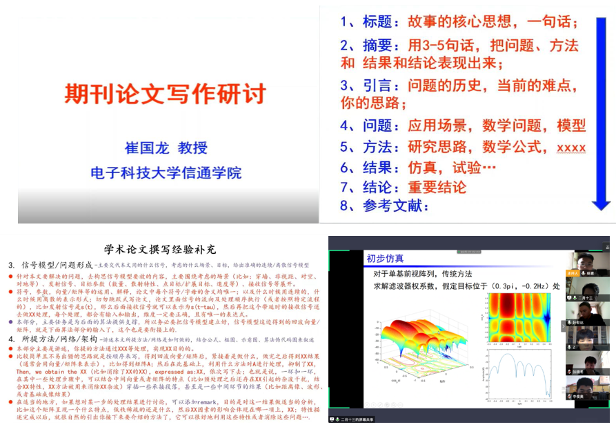 疫情期间,团队并没有停止科研的脚步。杨建宇老师带领老师团队为同学们制定了周密的科研与学习计划。在老师们的带领下,同学们利用线上多个平台交流灵活开展科研活动,实现“云科研”。老师们利用QQ群、微信群、腾讯会议等与大家进行交流,并及时和同学们分享相关文献及各种学习资料,帮助同学们更好地进行线上学习、在家科研,尽可能降低疫情对科研学习进度的影响。团队崔国龙老师、郭世盛老师与几位博士生还开展线上科研分享会,交流学术论文写作方法,分享学术论文写作心得,并鼓励教研室同学积极科研,发表高质量科研成果。