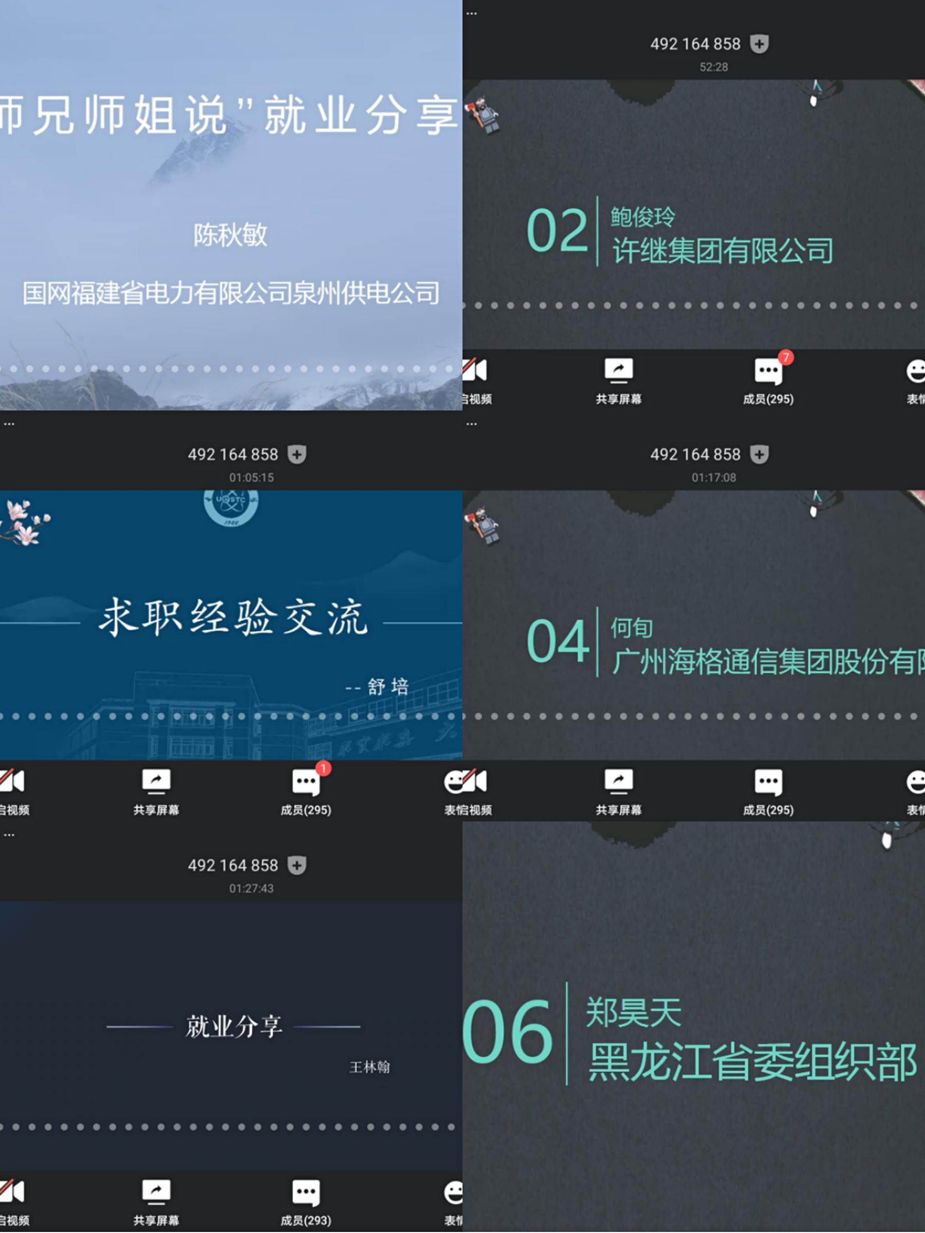 陈秋敏师姐从国网的招聘大纲开始讲起,详细介绍了不同省份国网招聘的不同要求。师姐向大家分享了自己参与国网提前批招聘的求职经验。最后,她鼓励大家提前了解用人单位的现状和未来发展,为今后的职业选择做好准备。鲍俊玲师姐为大家介绍了许继集团的基本情况。师姐从自身为何选择国有企业出发,建议同学们提前做好准备。同时她还透露许继集团近年来招聘女生较多,希望学妹们积极尝试。接下来的舒培师兄和何旬师姐主要从求职过程中的笔试和面试经历给大家分享经验。两位师兄师姐还给大家分享了一些个人见闻和笔试面试技巧。王林翰师兄则主要从着手找工作到最后收到offer的整个过程进行梳理,给出自己的中肯意见和建议。他鼓励线上的各位同学相信自己的实力,不卑不亢,双向选择。