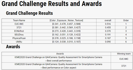 除了日常的论文分享外,在疫情期间,吴庆波老师积极地指导团队成员进行一些科研竞赛,在今年4月份举行的ICME智能手机摄像质量评价比赛中,团队成员(队名为3721)取得了单项冠军(颜色指标上最佳评价)以及总成绩第二的好成绩。在比赛准备期间,吴庆波老师积极地和团队成员进行沟通交流,对网络设计,训练和测试等方面进行细致的指导,团队成员在比赛收获到了很多科研思路和代码技巧。